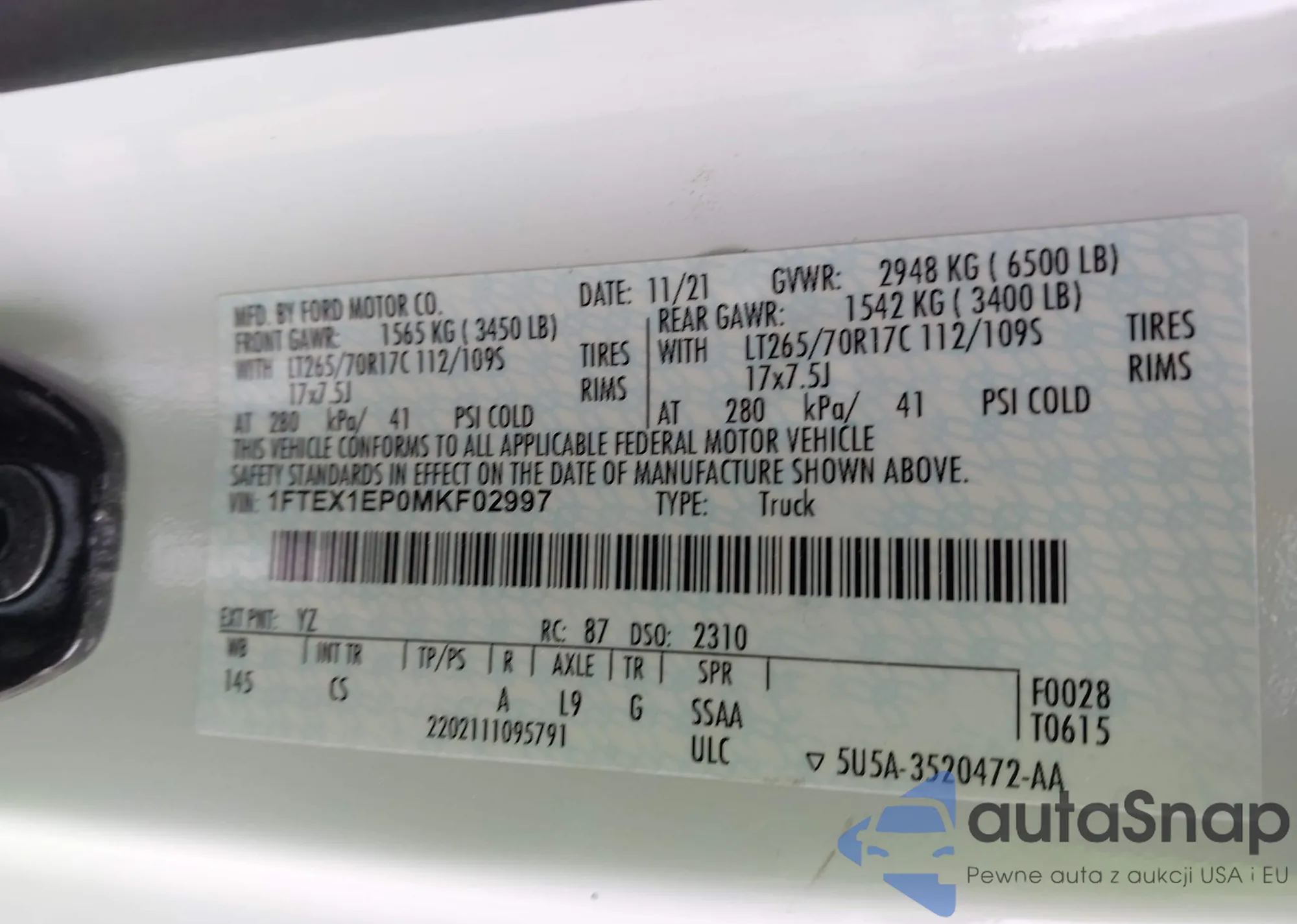 LOT: 42308799 VIN: 1FTEX1EP0MKF02997