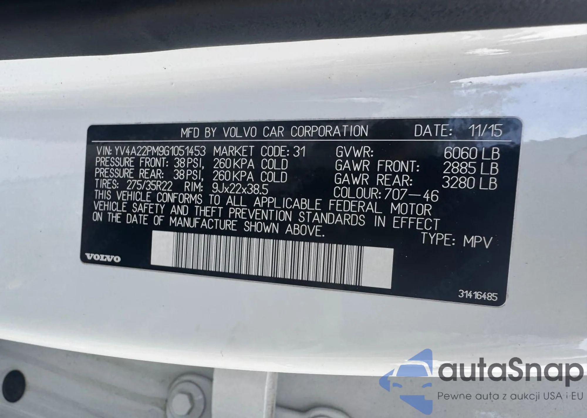 LOT: 59424165 VIN: YV4A22PM9G1051453