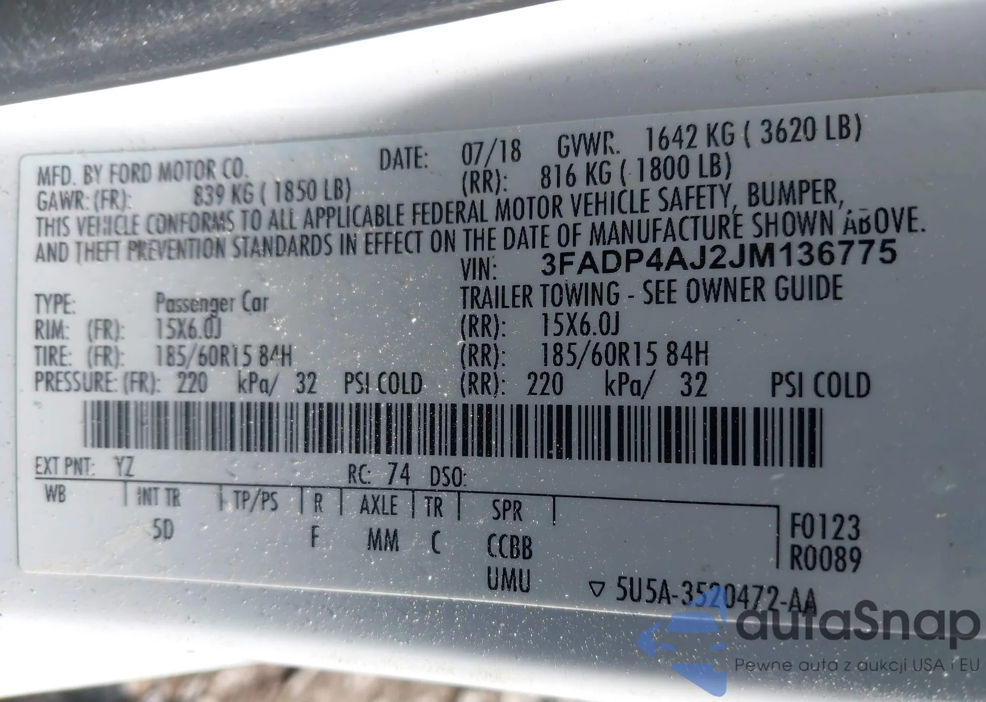 • VIN 3FADP4AJ2JM136775