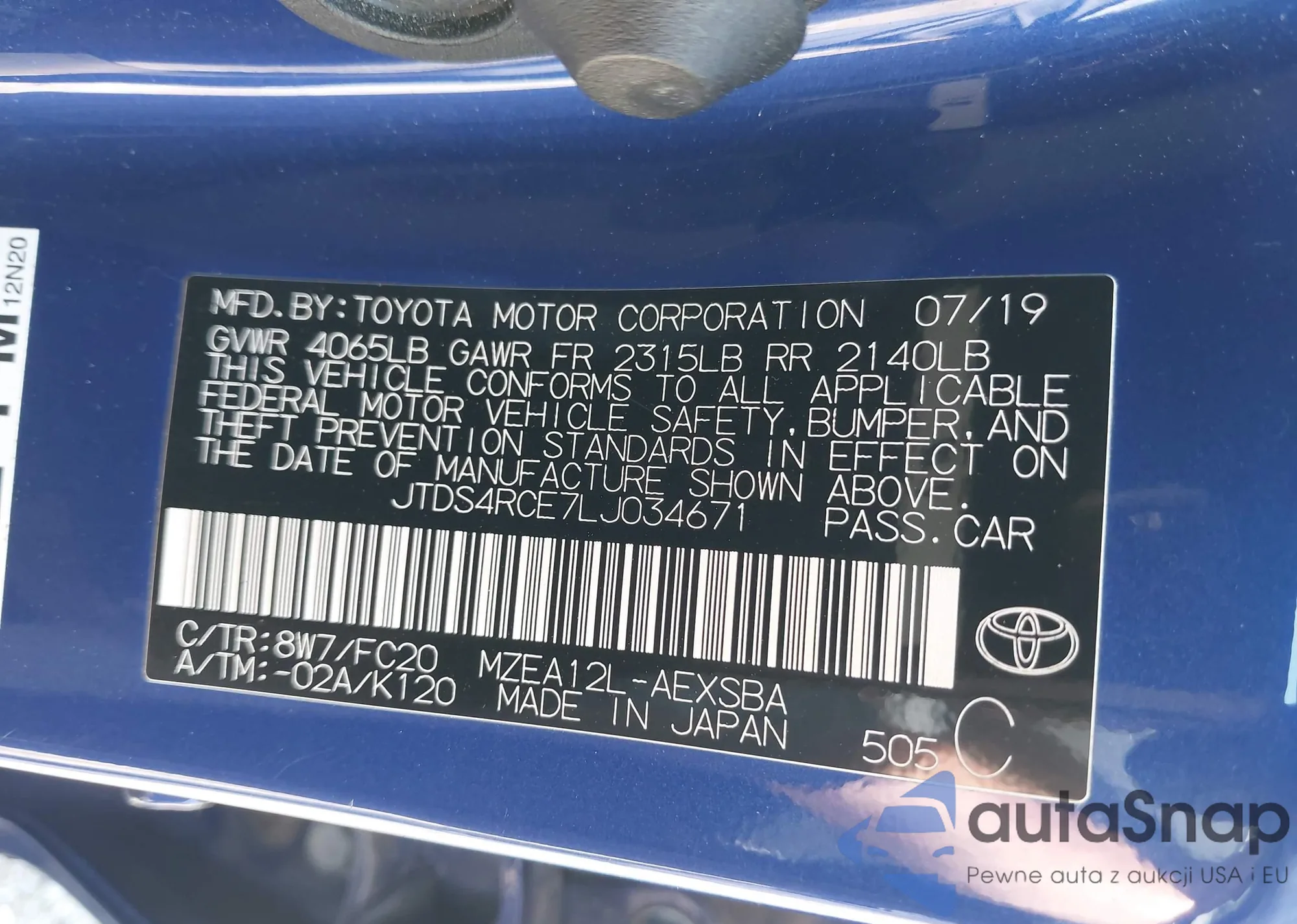 LOT: 42219593 VIN: JTDS4RCE7LJ034671