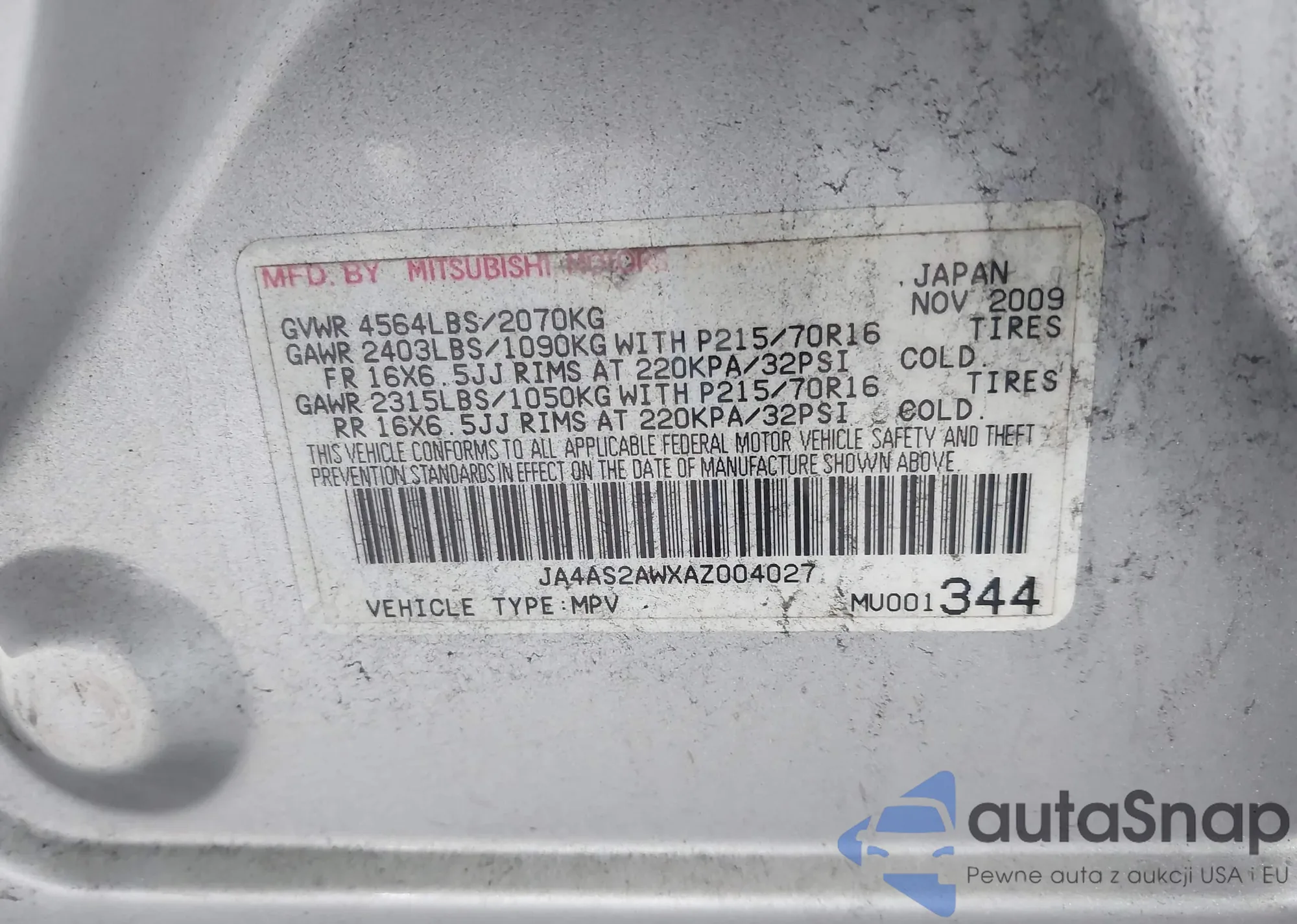 • VIN JA4AS2AWXAZ004027
