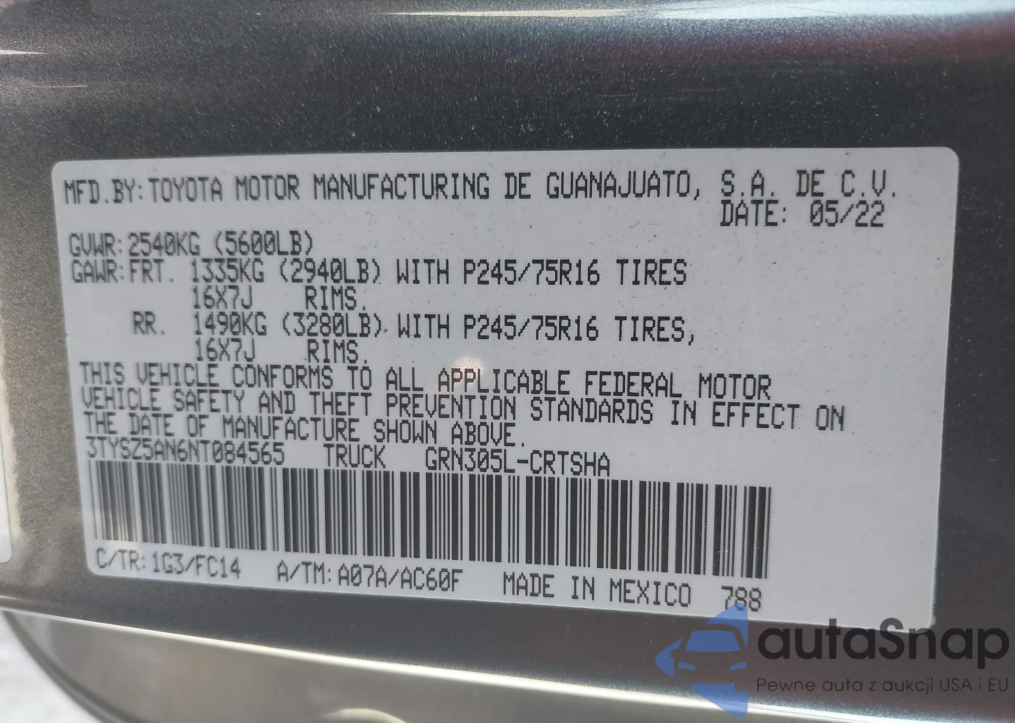 • VIN 3TYSZ5AN6NT084565