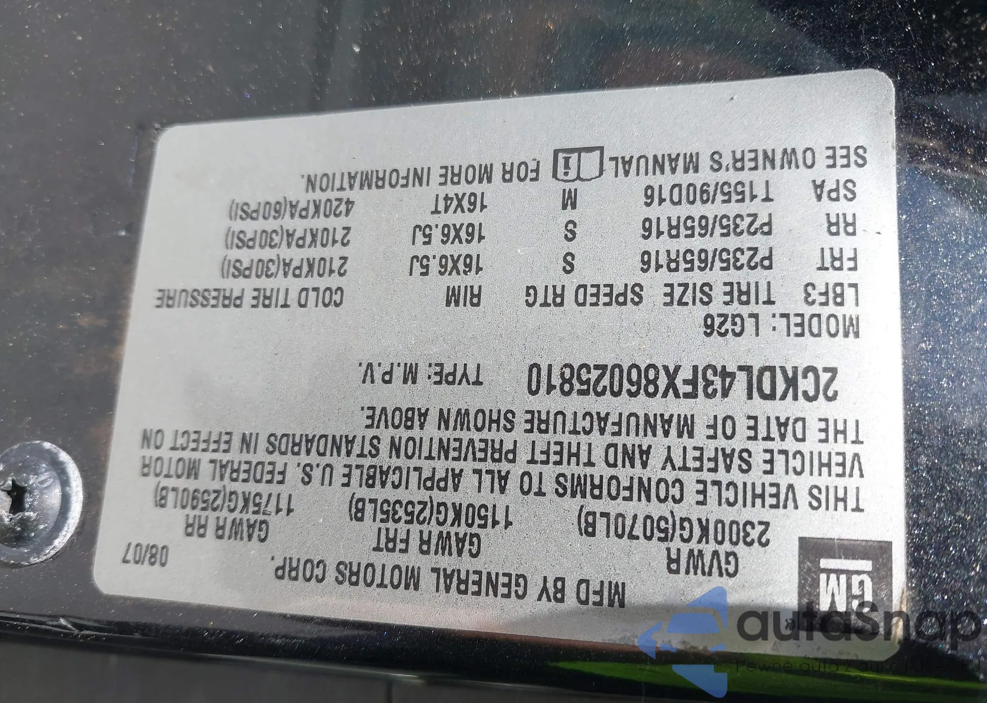 • VIN 2CKDL43FX86025810
