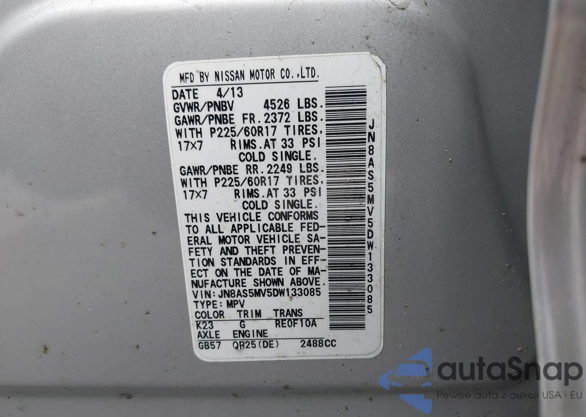 LOT: 42232800 VIN: JN8AF5MR2DT223447
