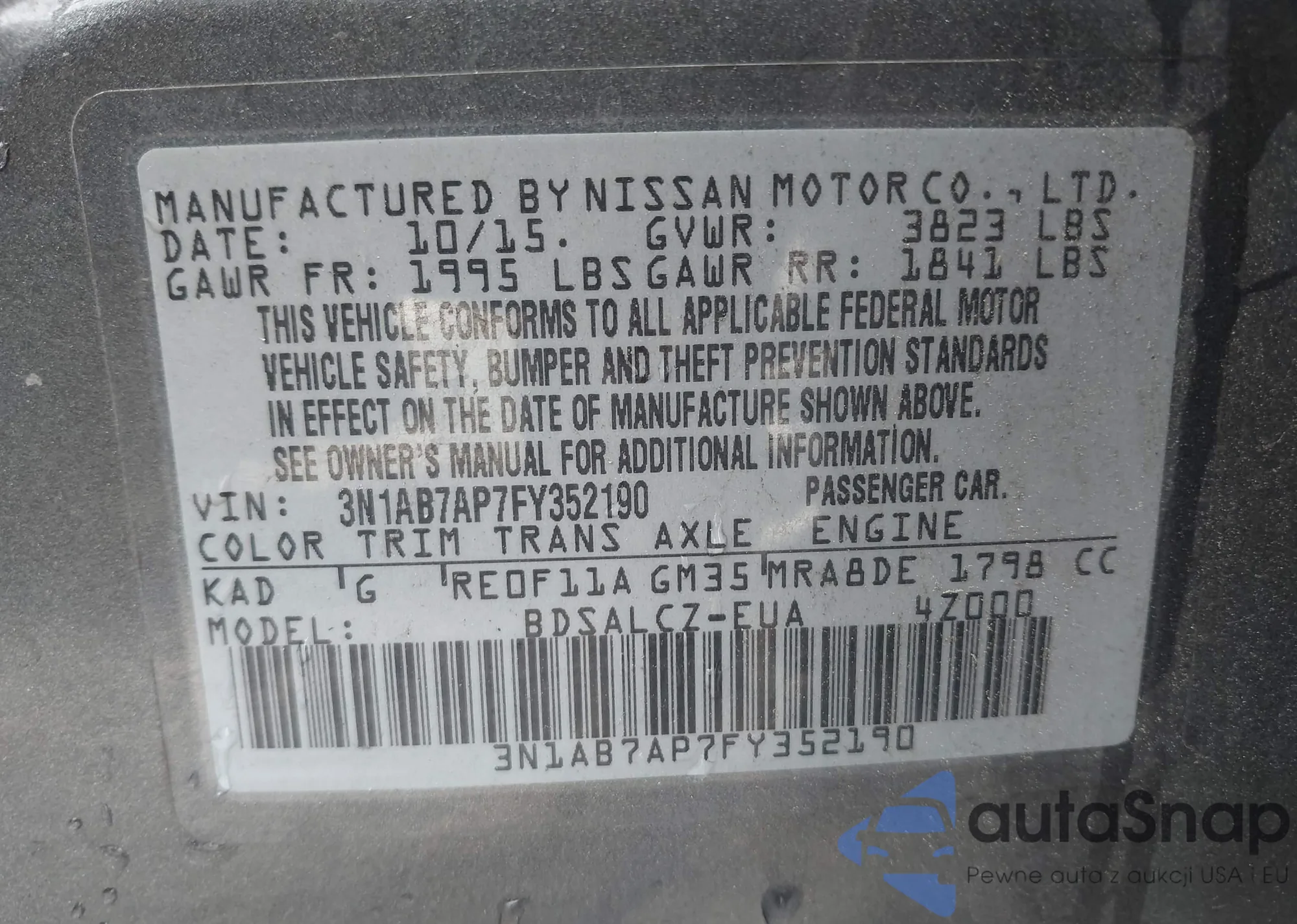 LOT: 42352039 VIN: 3N1AB7AP7FY352190