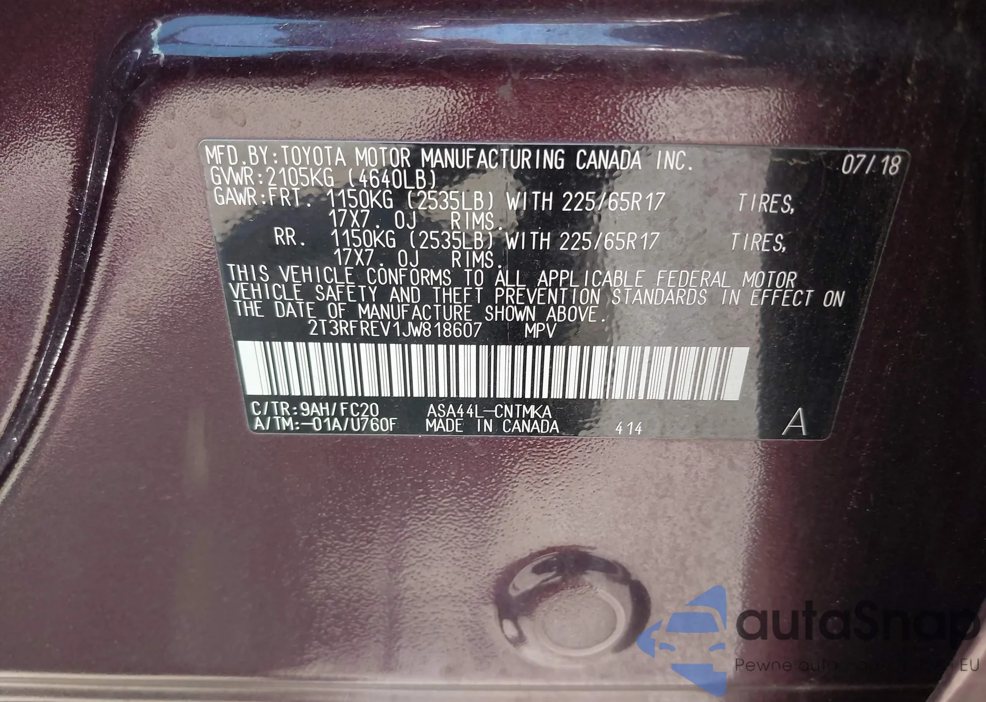 • VIN 2T3RFREV1JW818607