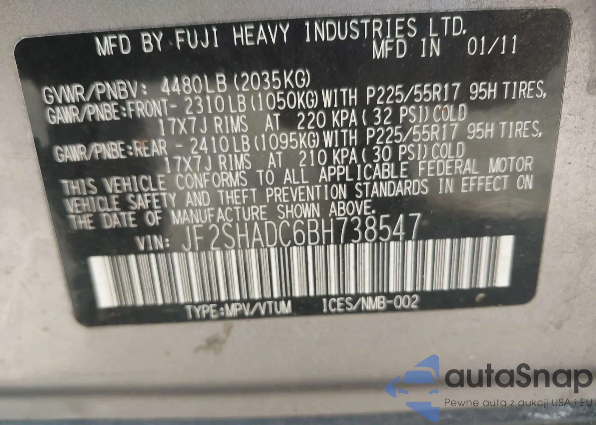 LOT: 42190898 VIN: JF2SHADC6BH738547