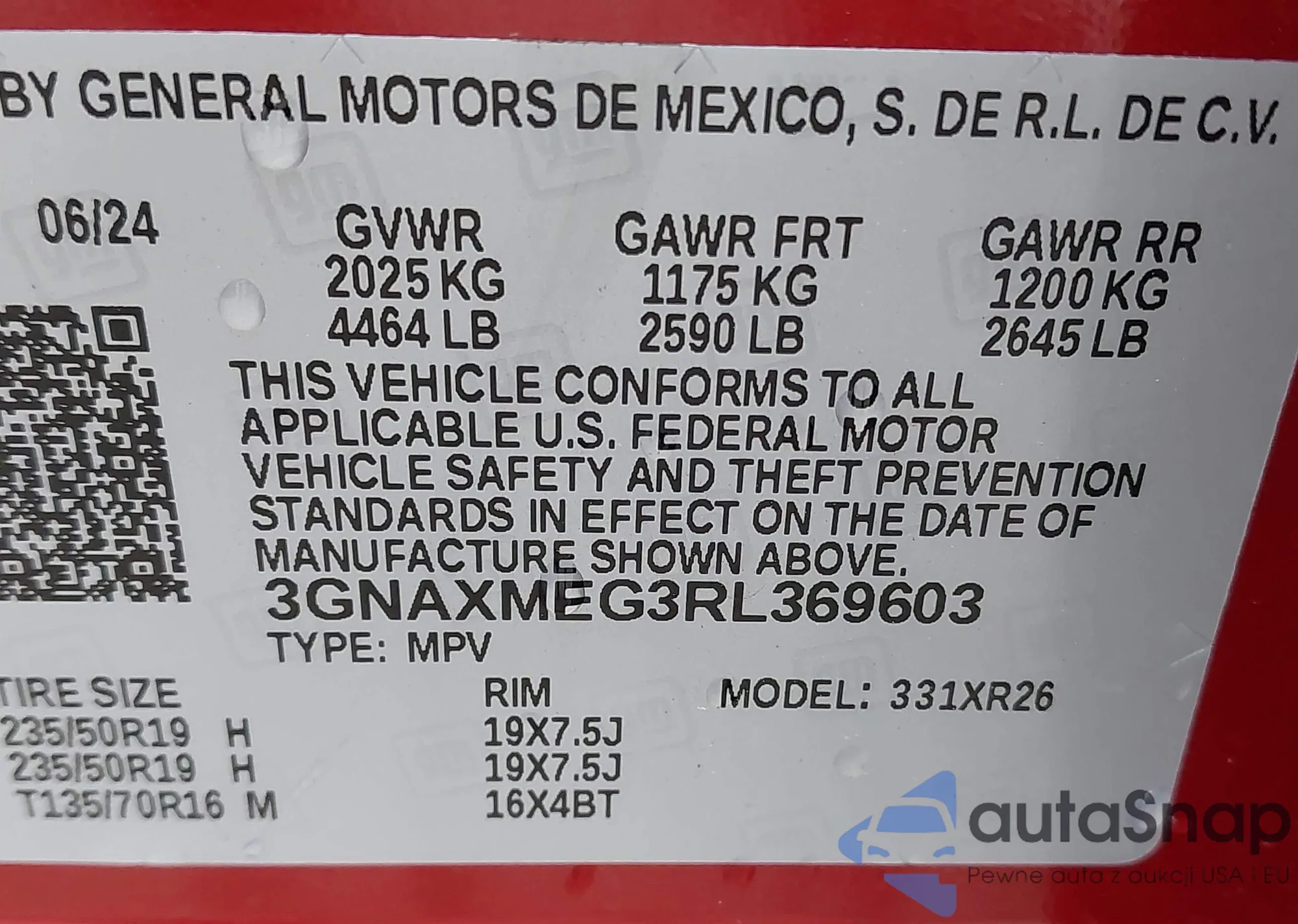 LOT: 42244009 VIN: 3GNAXMEG3RL369603