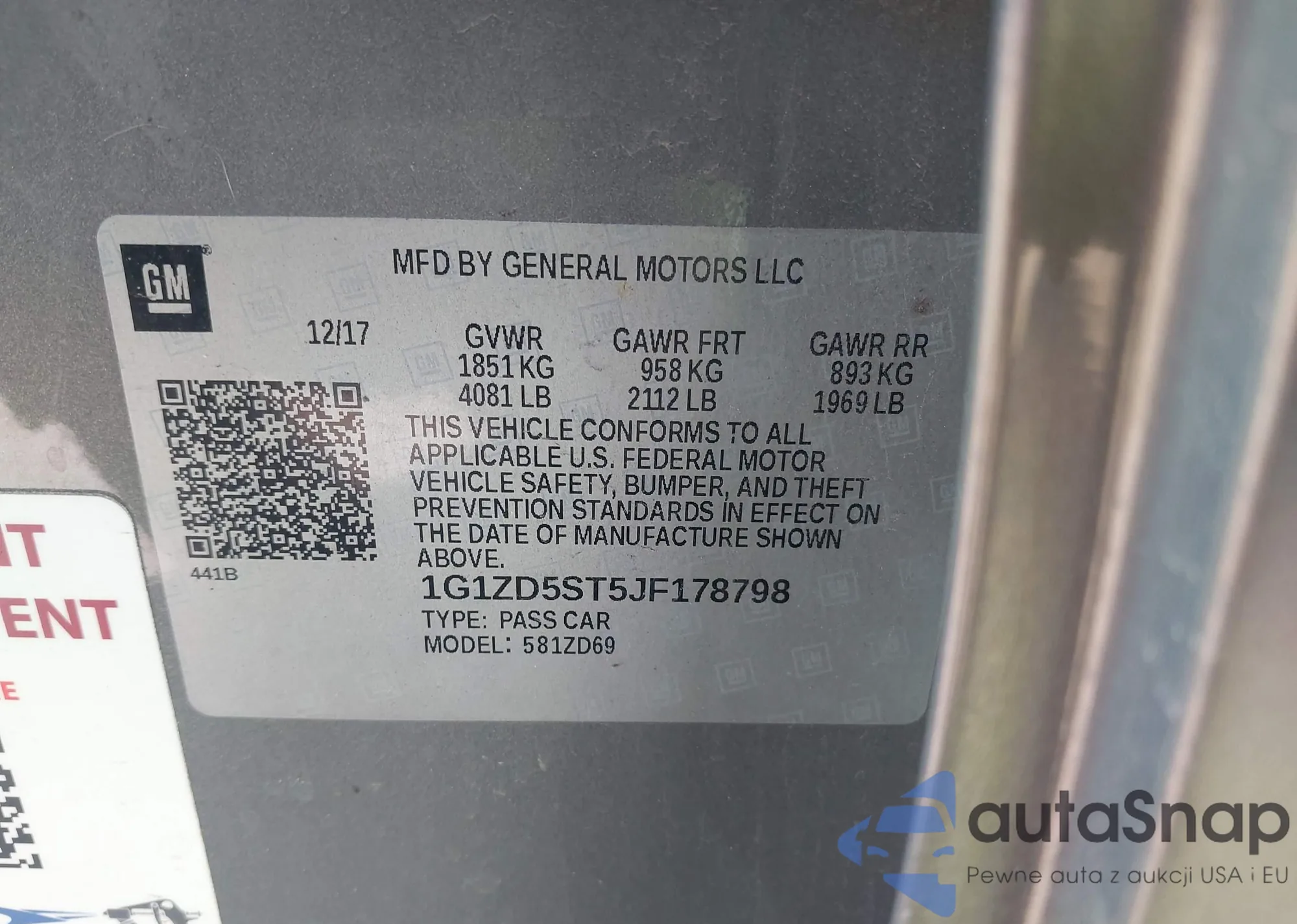 LOT: 42149010 VIN: 1G1ZD5ST5JF178798