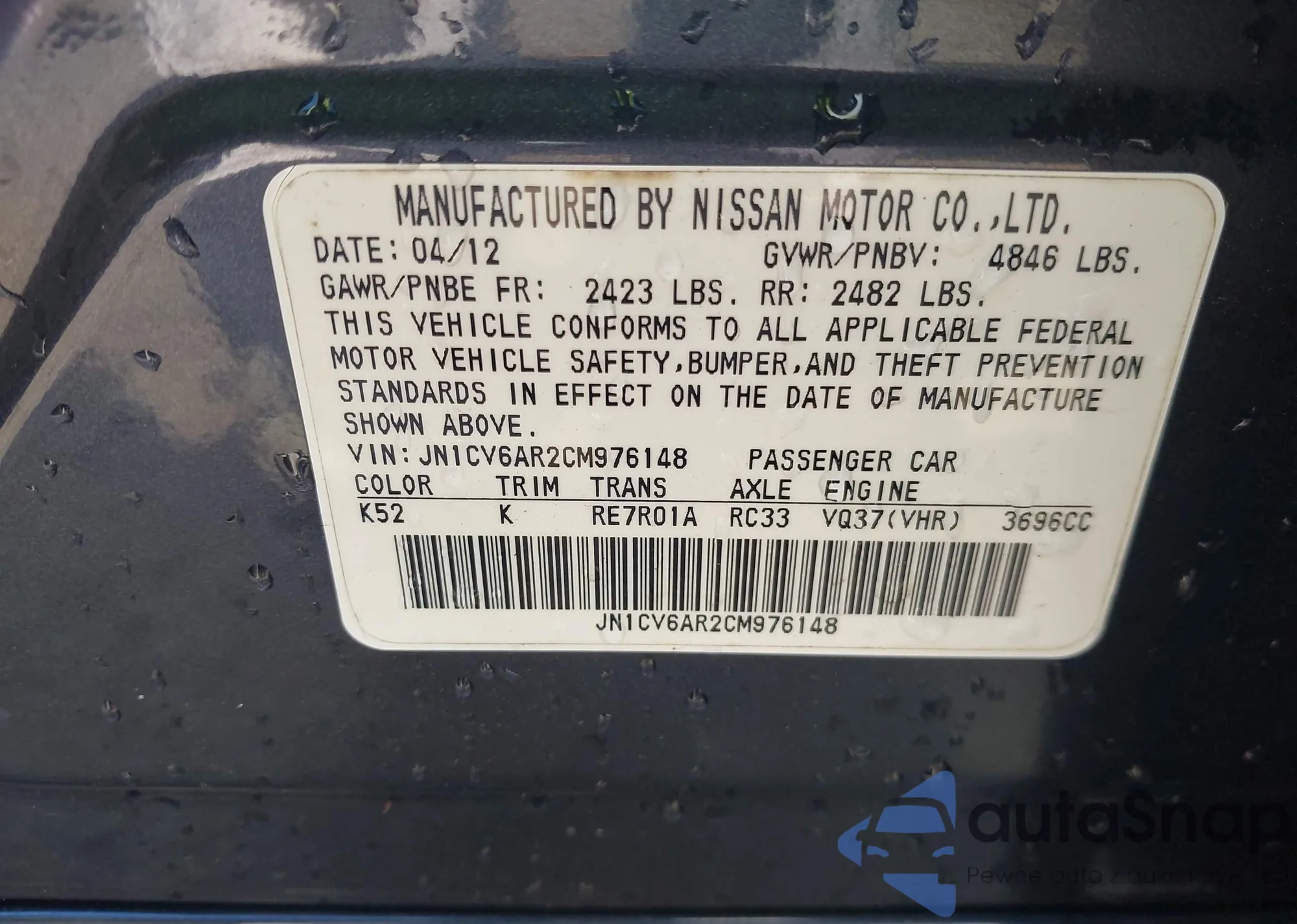 LOT: 42251772 VIN: JN1CV6AR2CM976148