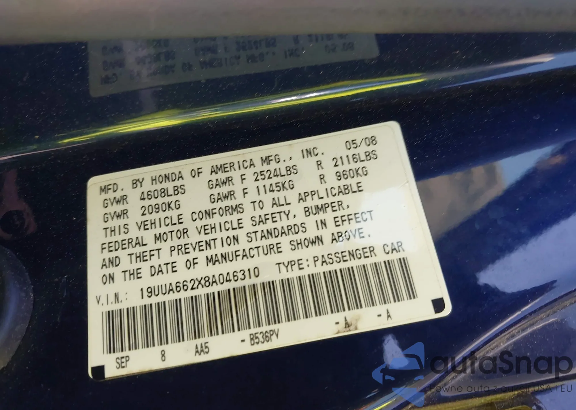LOT: 41886563 VIN: 19UUA662X8A046310