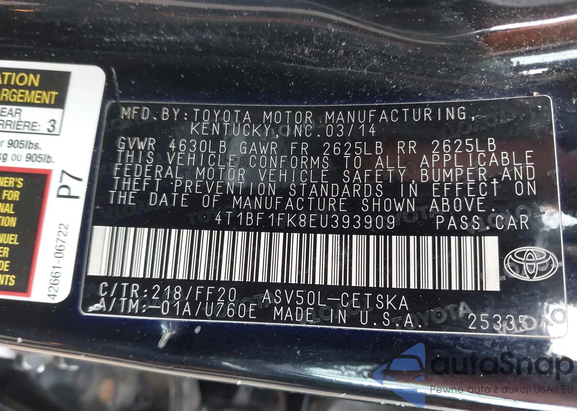 • VIN 4T1BF1FK8EU393909