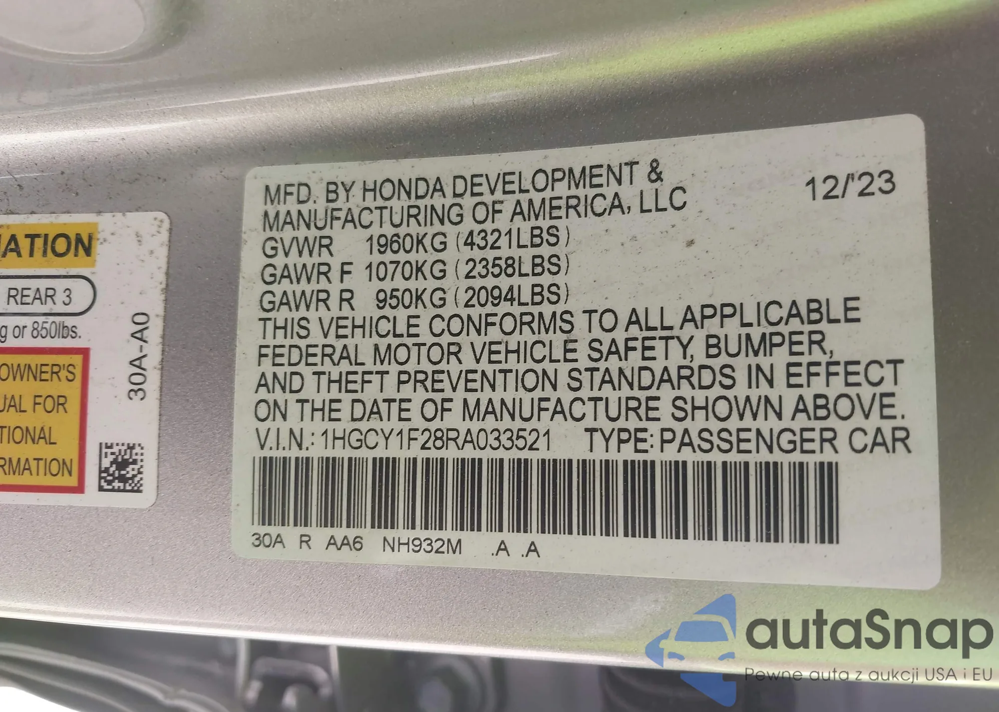 • VIN 1HGCY1F28RA033521