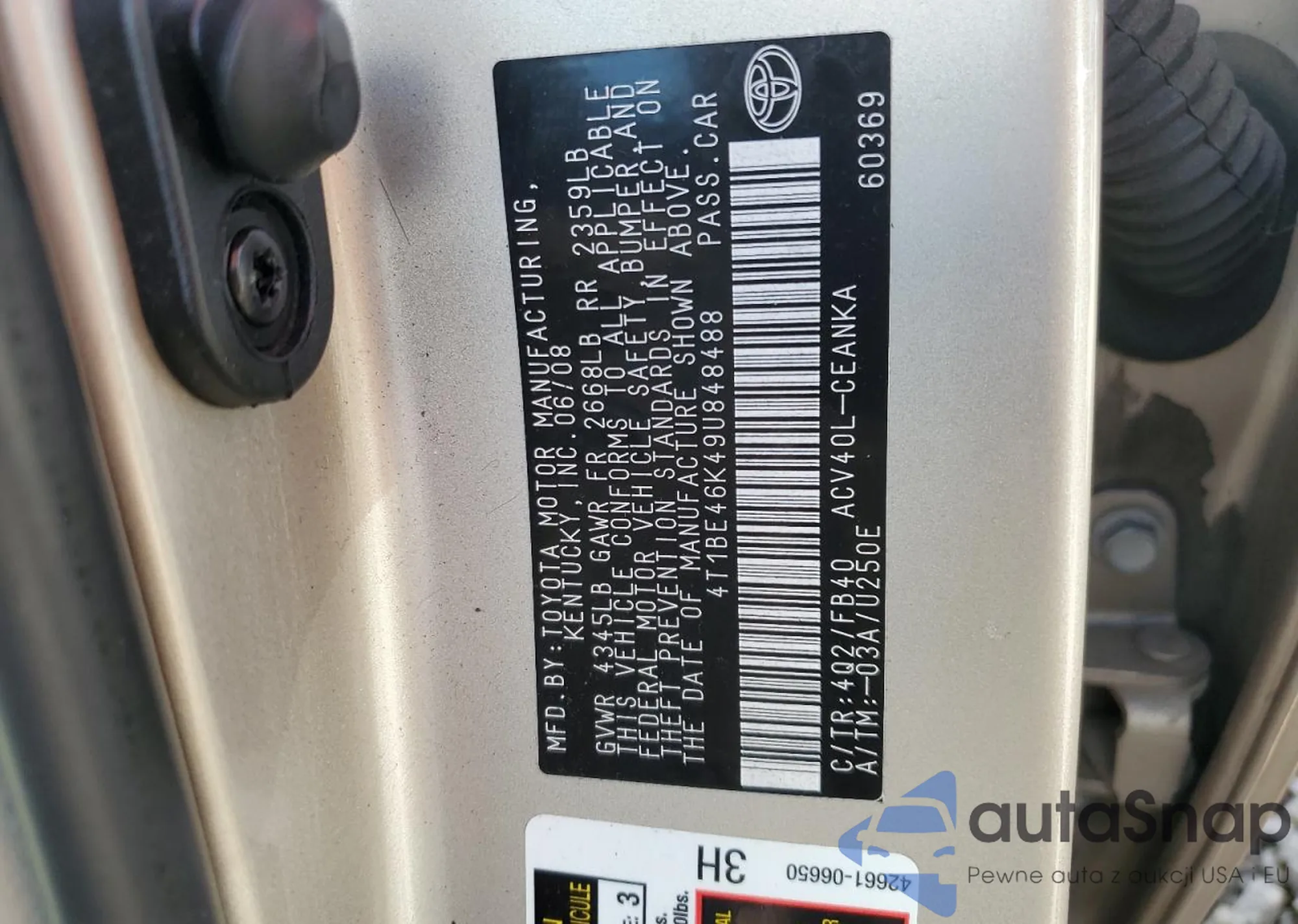 LOT: 45997045 VIN: 4T1BE46K49U848488