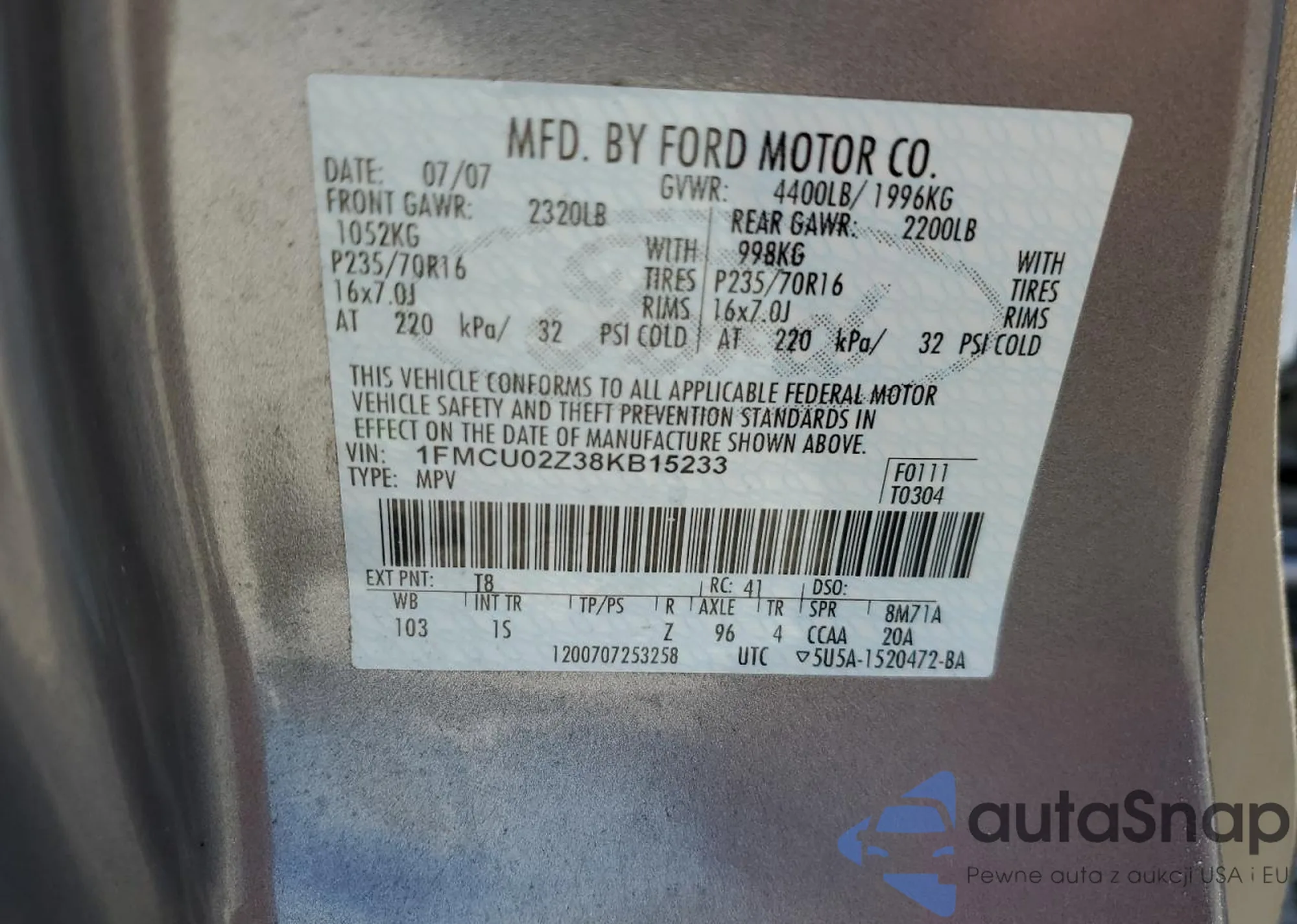 • VIN 1FMCU02Z38KB15233