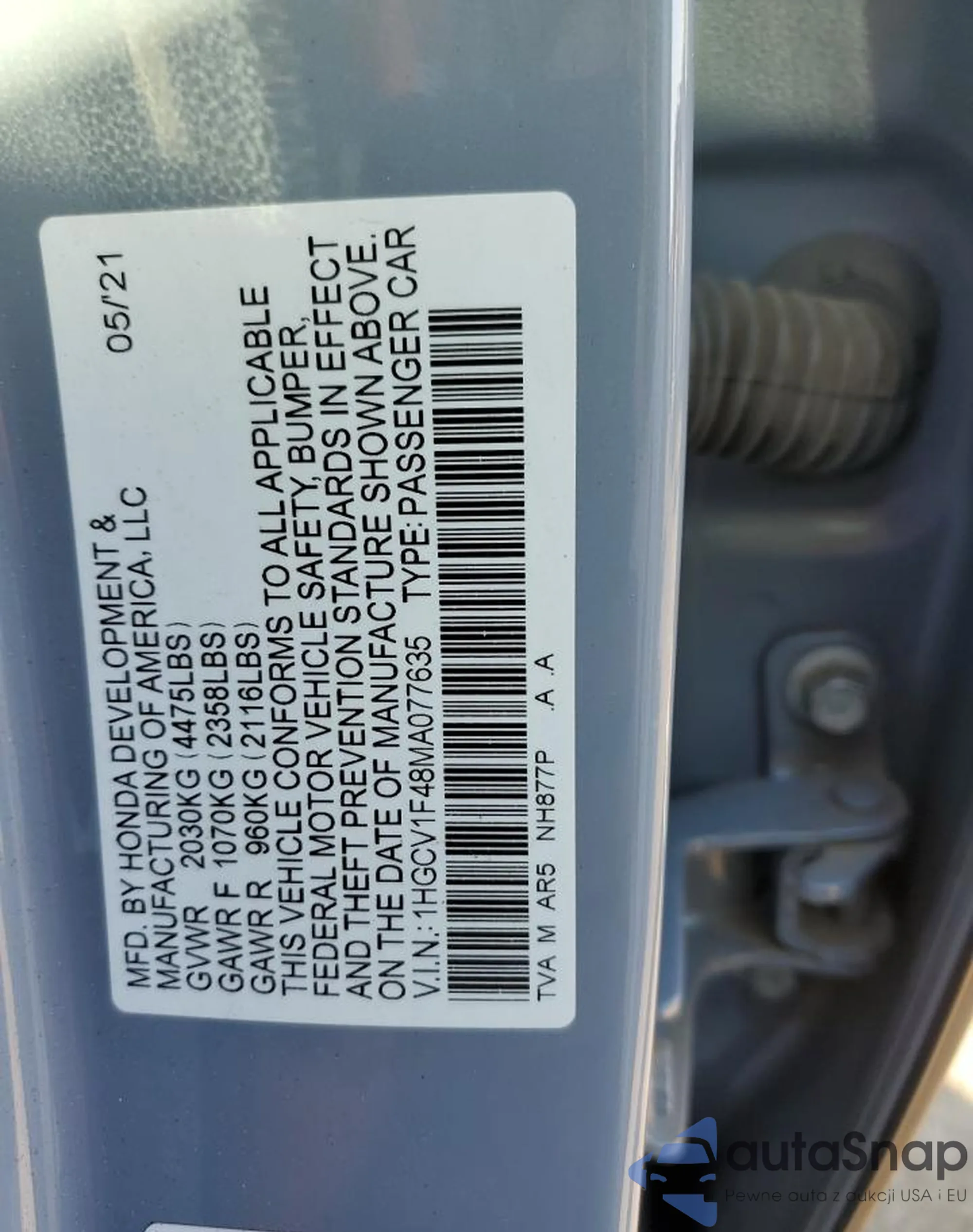LOT: 44773985 VIN: 1HGCV1F48MA077635