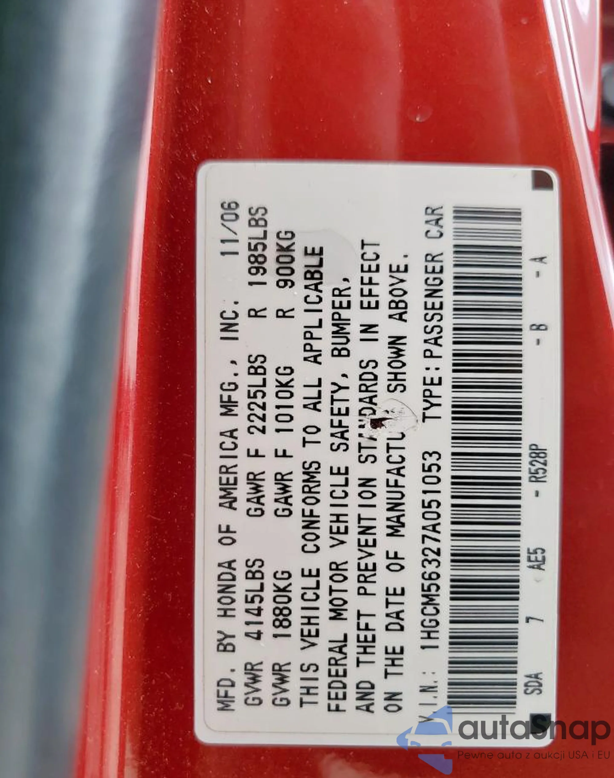 LOT: 60496395 VIN: 1HGCM56327A051053
