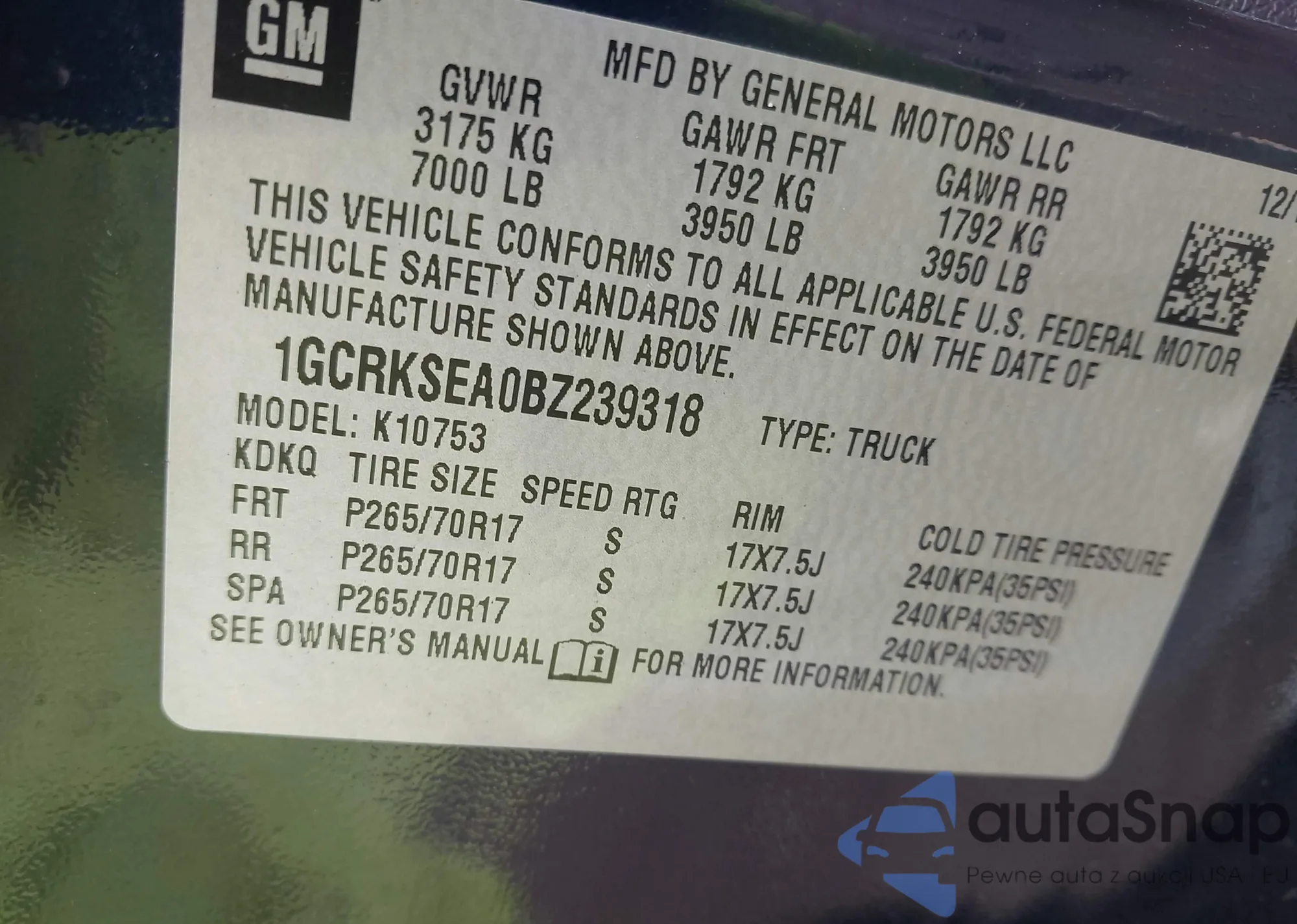 • VIN 1GCRKSEA0BZ239318