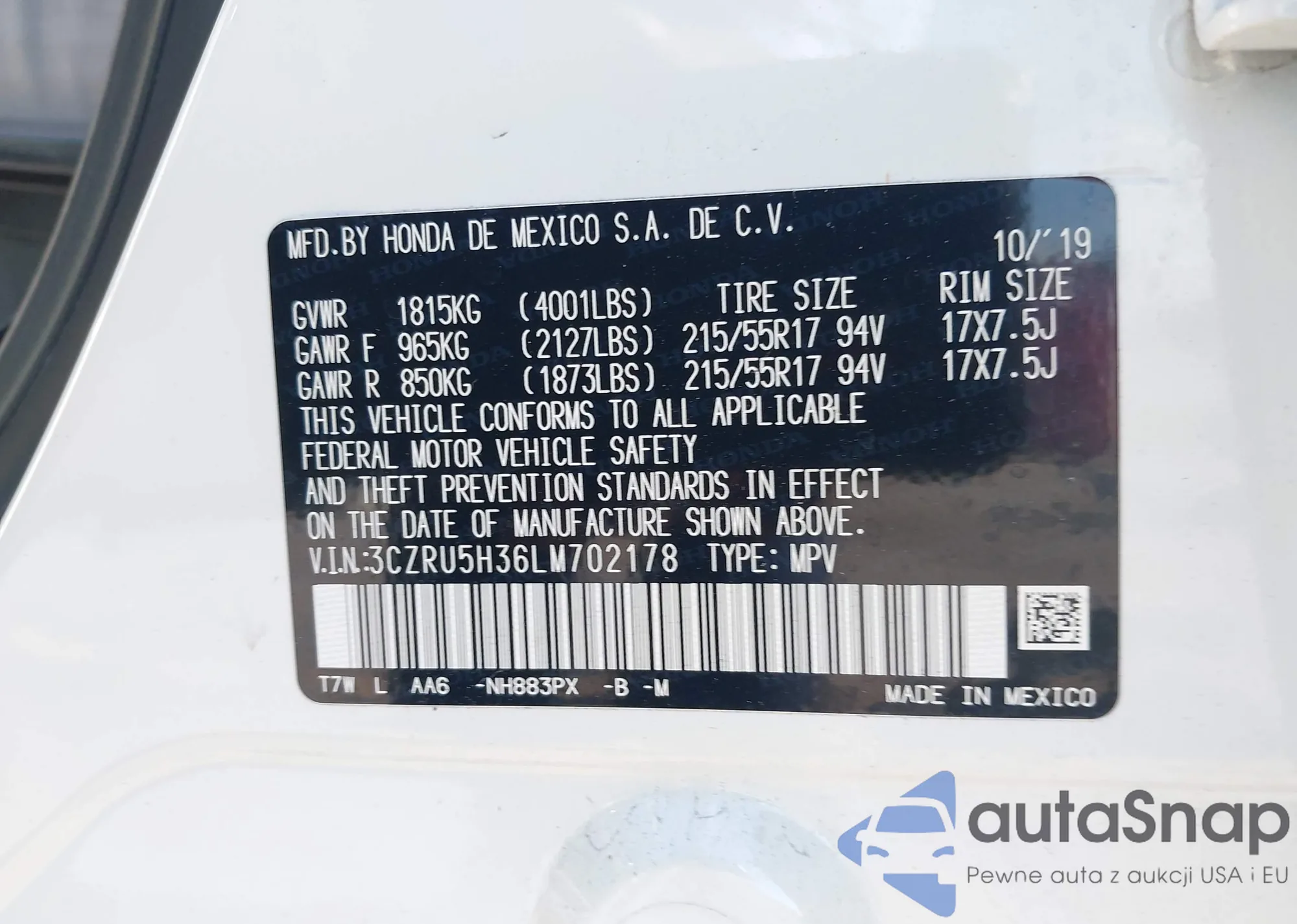 • VIN 3CZRU5H36LM702178