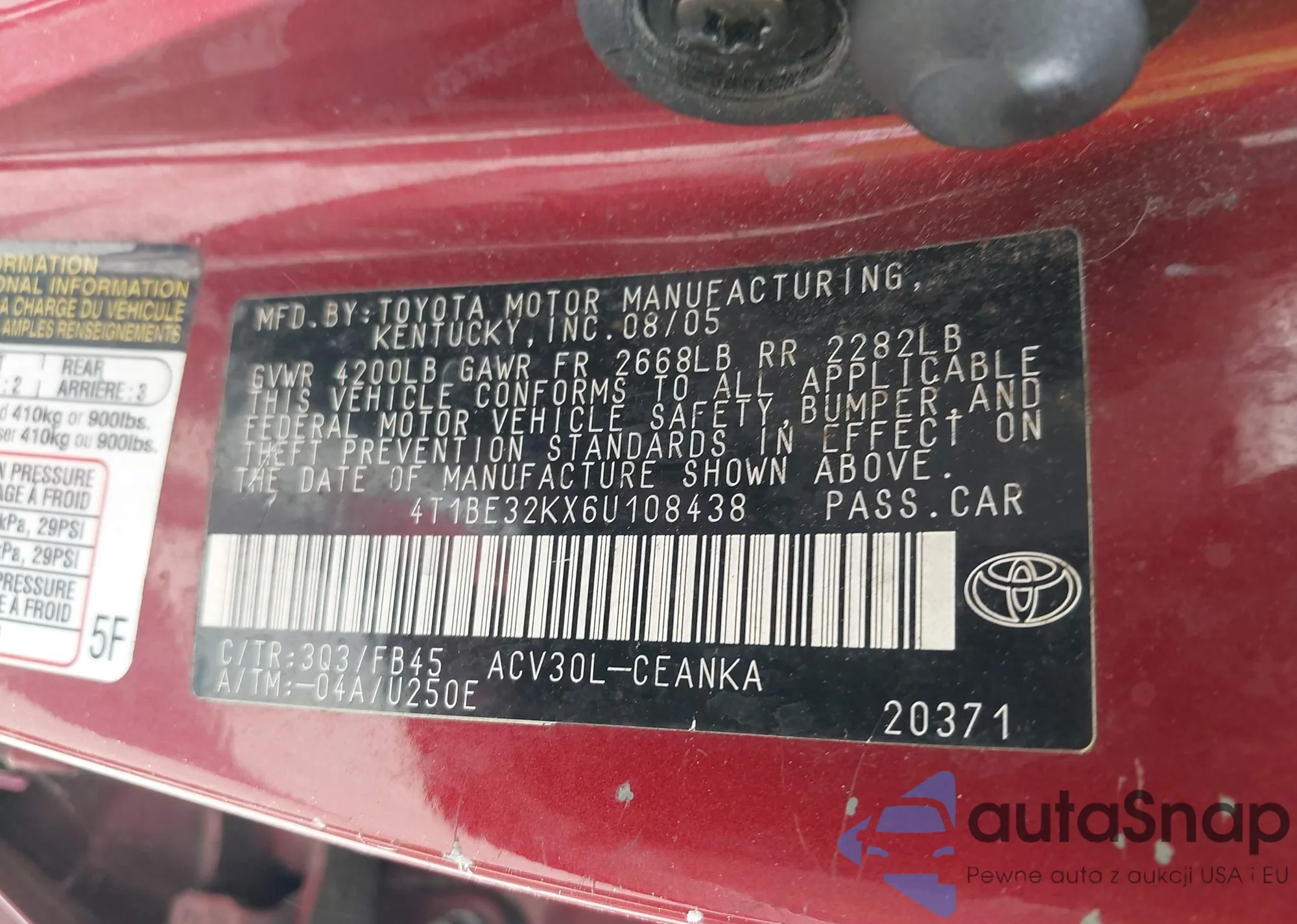 • VIN 4T1BE32KX6U108438