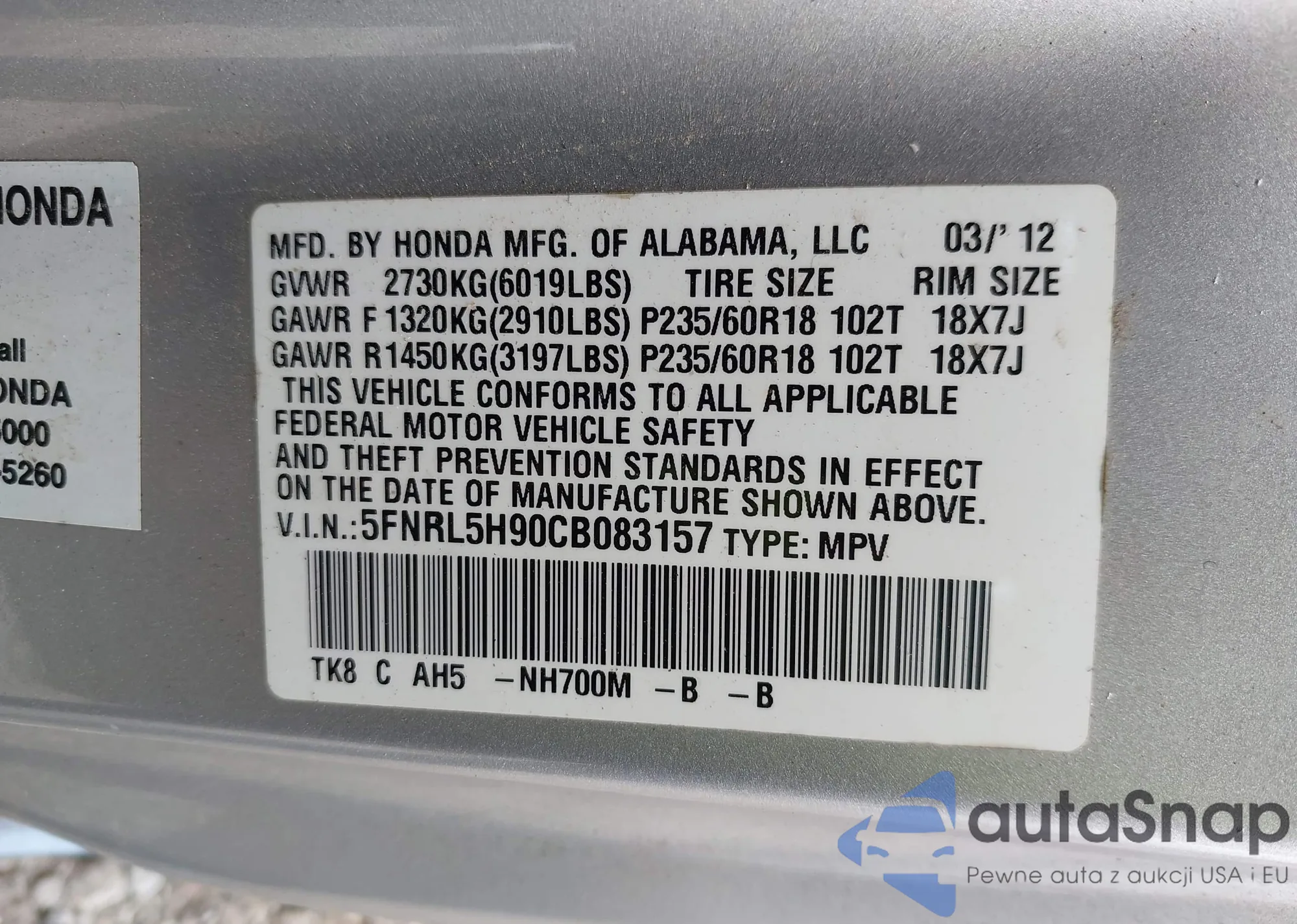 • VIN 5FNRL5H90CB083157