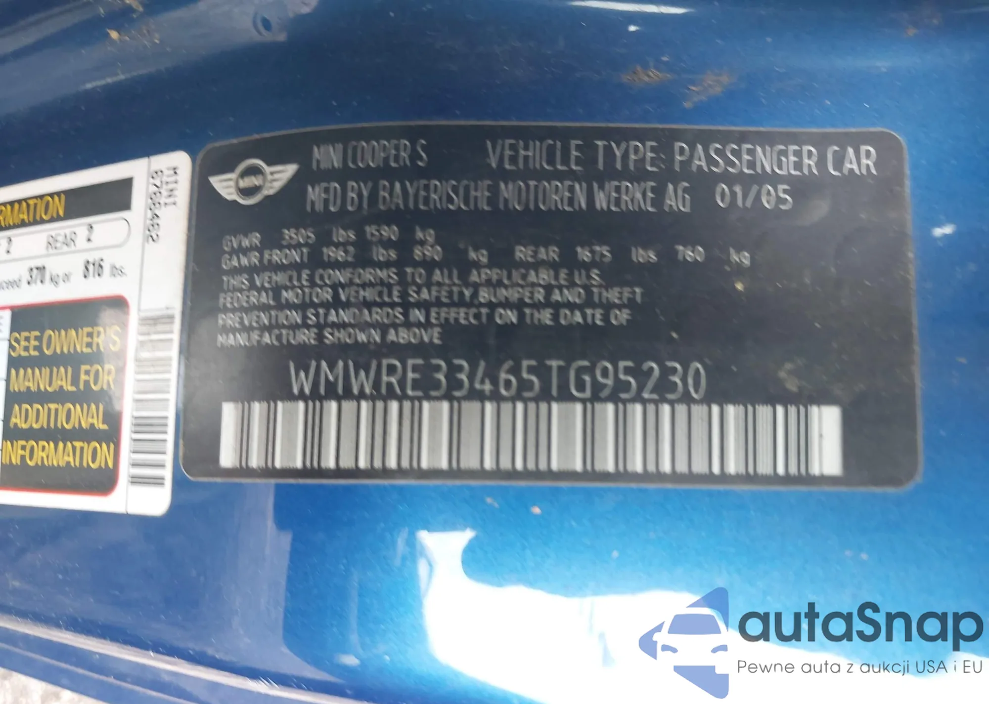 2005 Mini Cooper S z USA, uszkodzony, nr VIN WMWRE33465TG95230