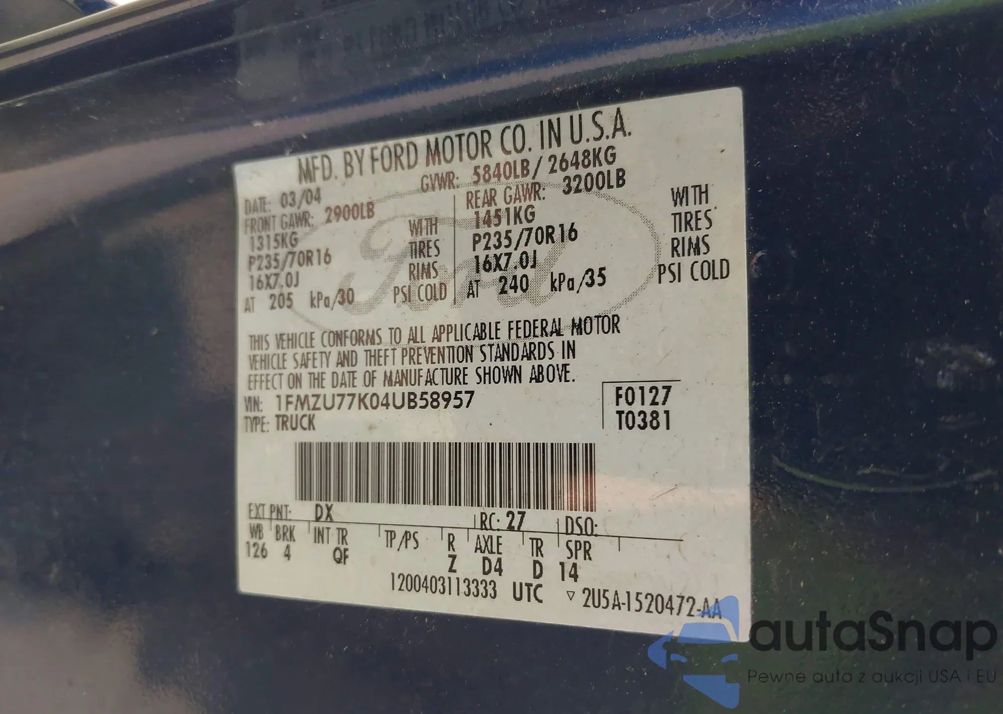 • VIN 1FMZU77K04UB58957