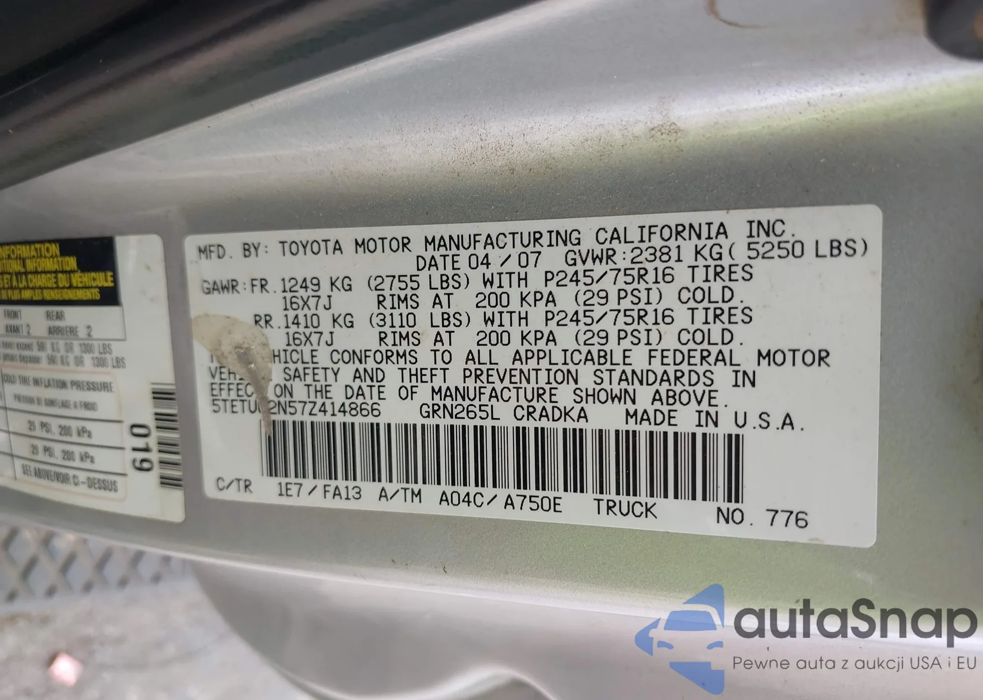 • VIN 5TETU62N57Z414866