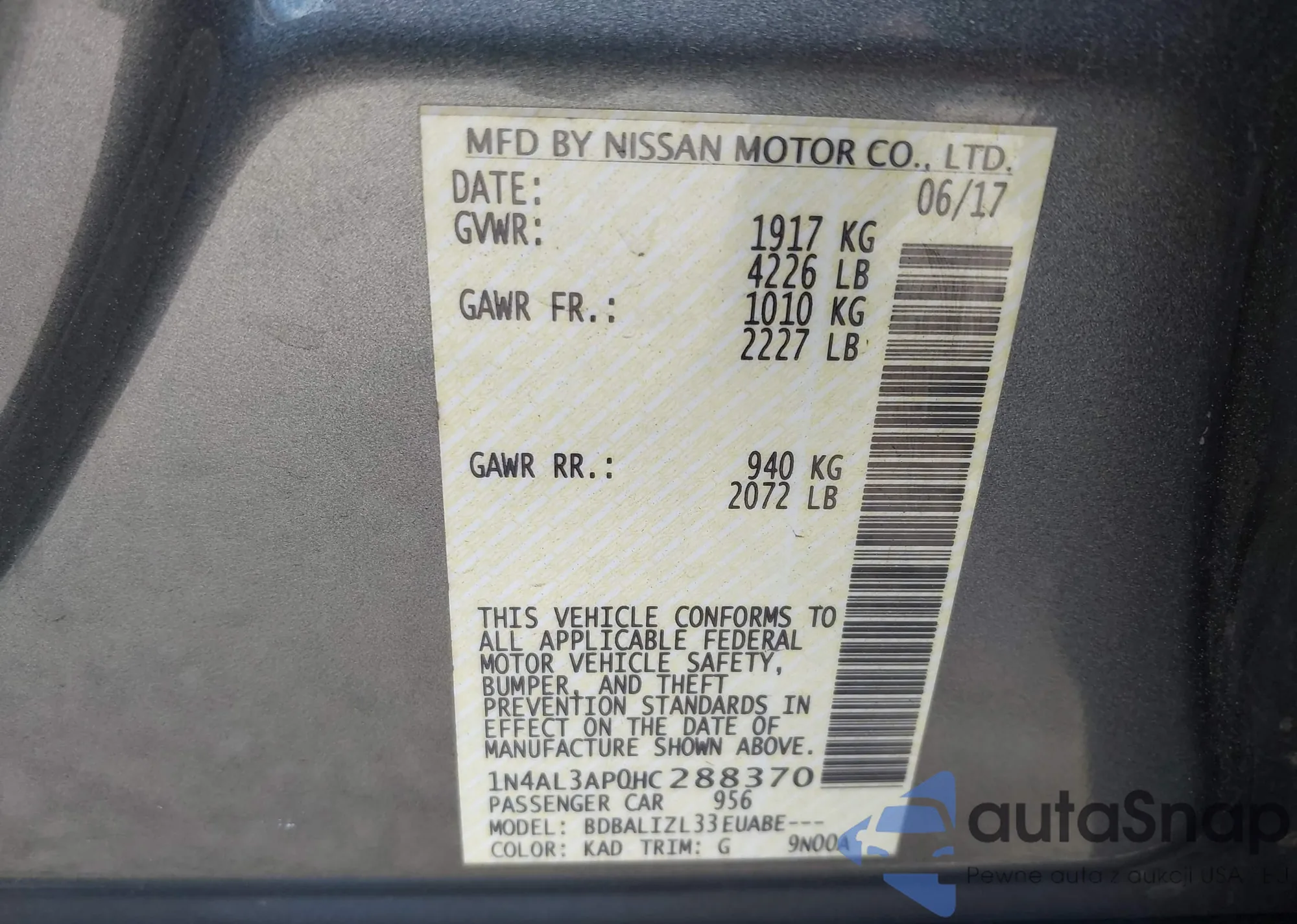 • VIN 1N4AL3AP0HC288370