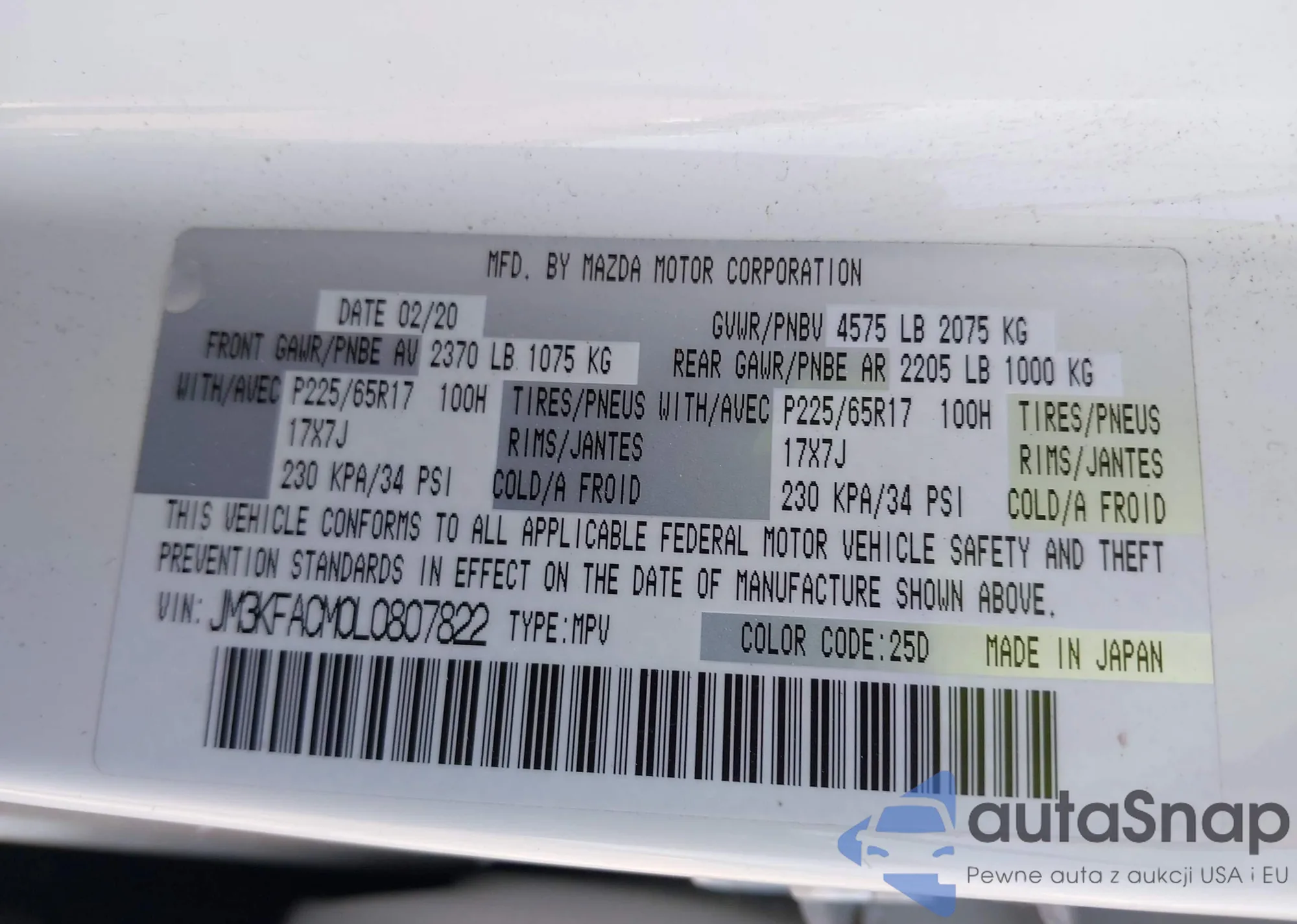 LOT: 42031645 VIN: JM3KFACM0L0807822