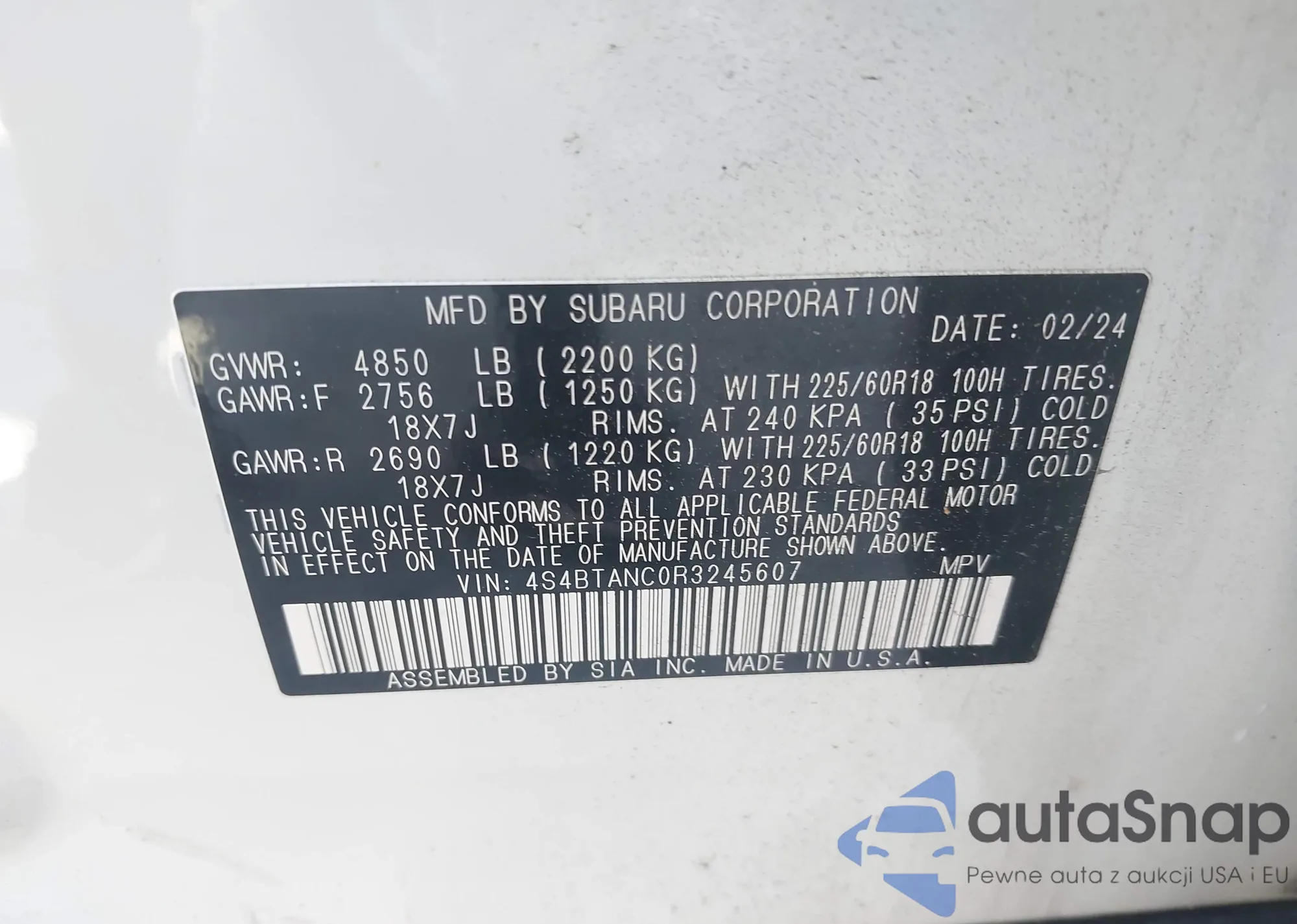 LOT: 42186812 VIN: 4S4BTANC0R3245607