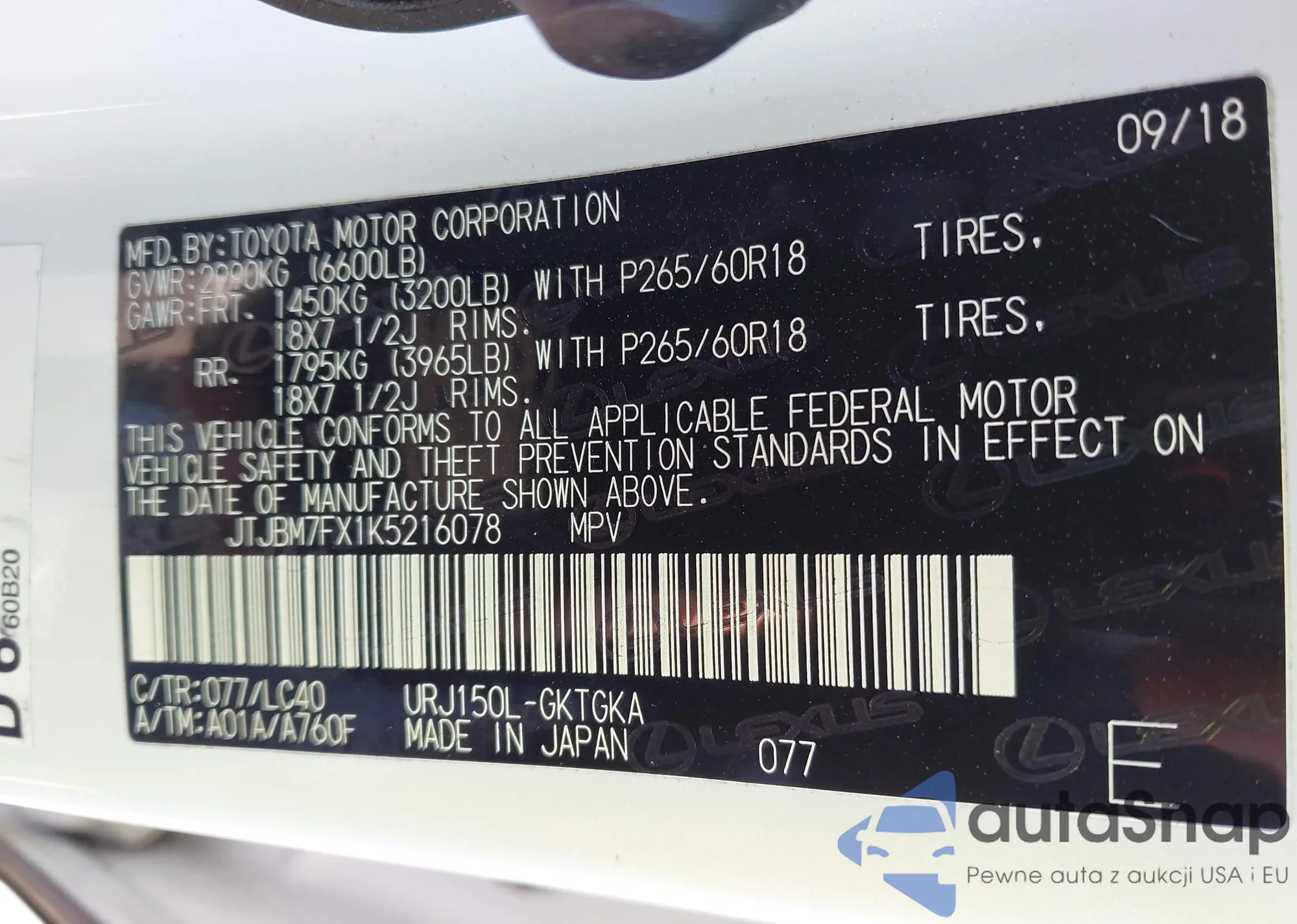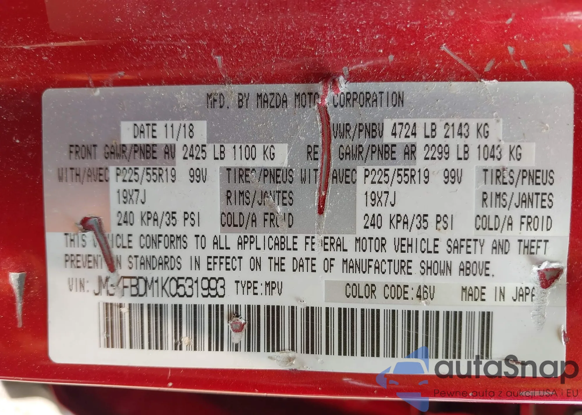LOT: 42387844 VIN: JM3KFBDM1K0531993