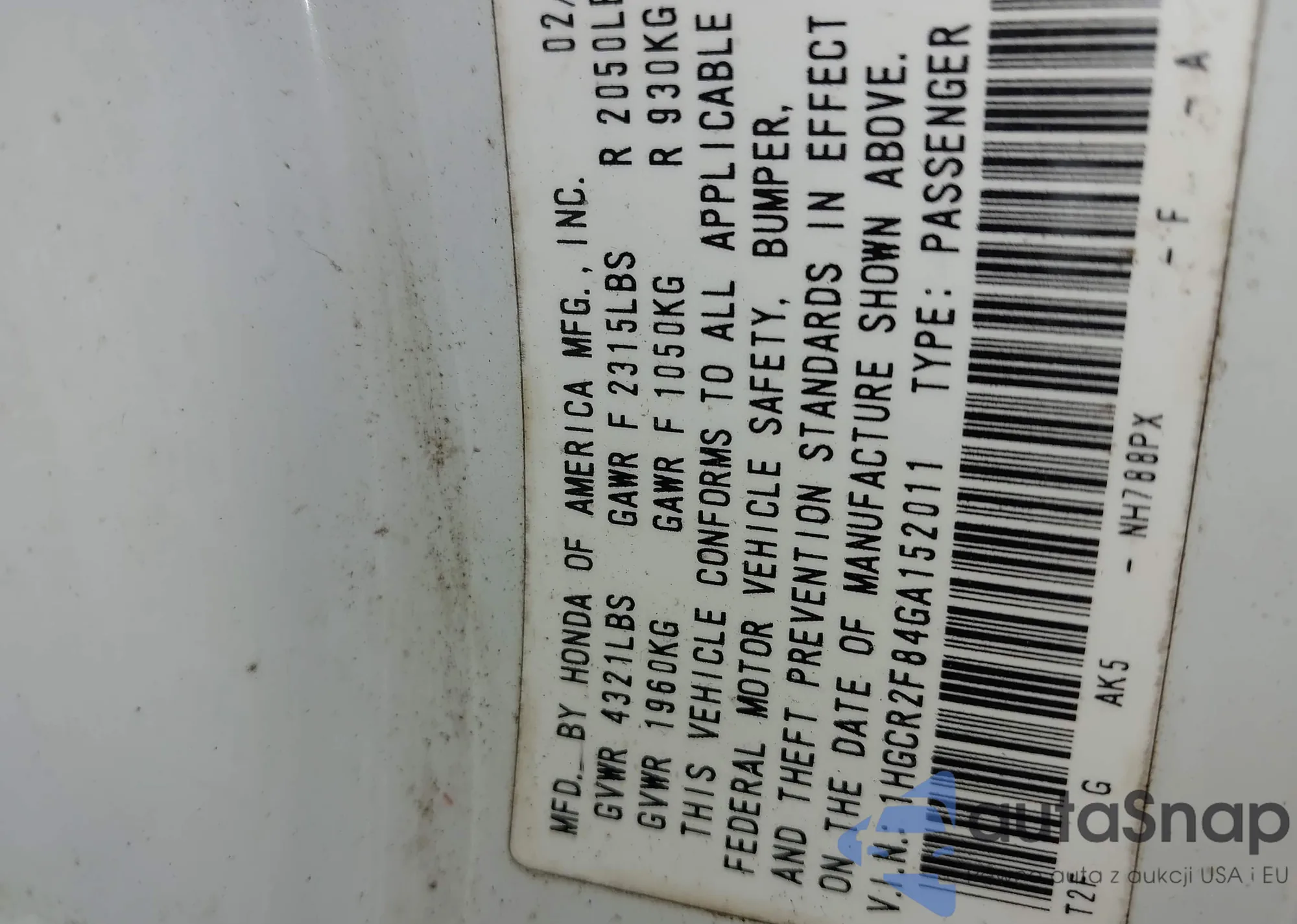 • VIN 1HGCR2F84GA152011
