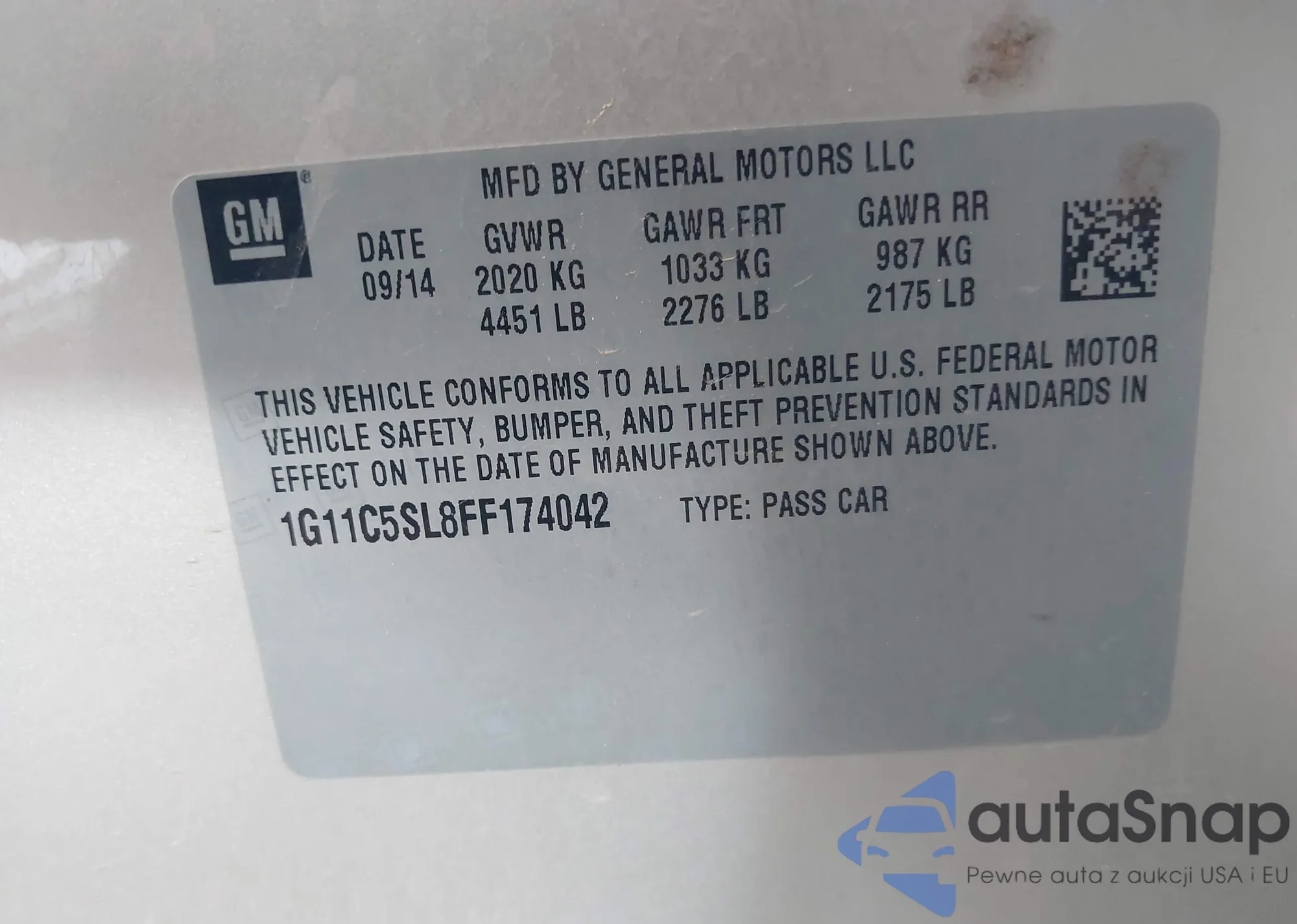 LOT: 42467165 VIN: 1G11C5SL8FF174042