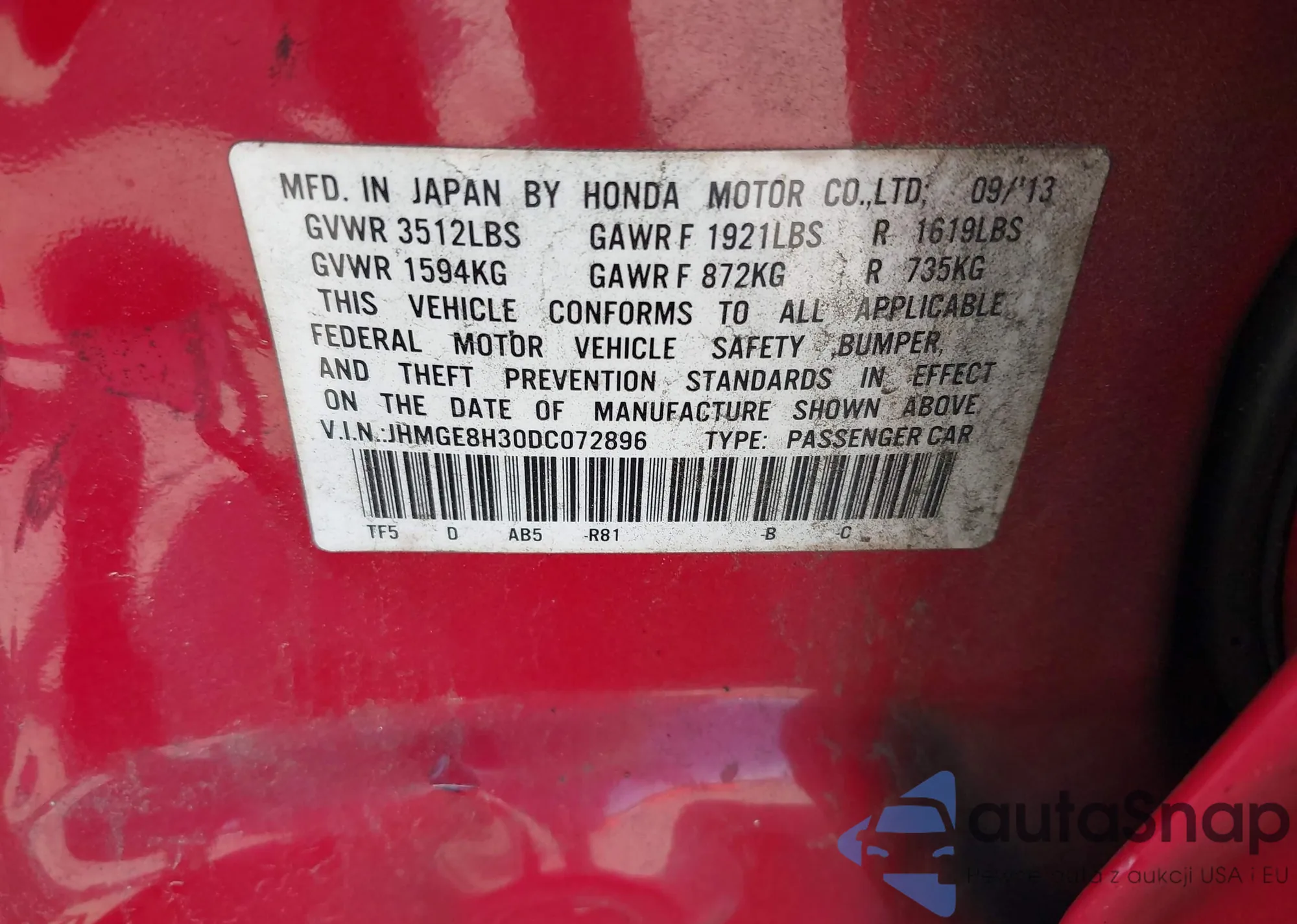 • VIN JHMGE8H30DC072896