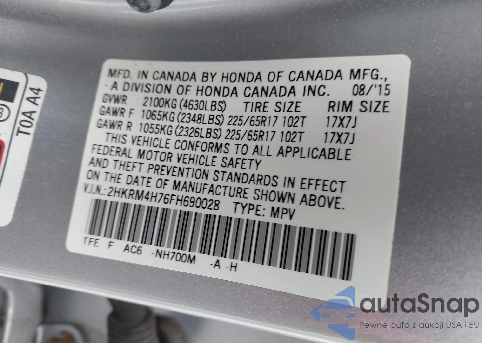 • VIN 2HKRM4H76FH690028