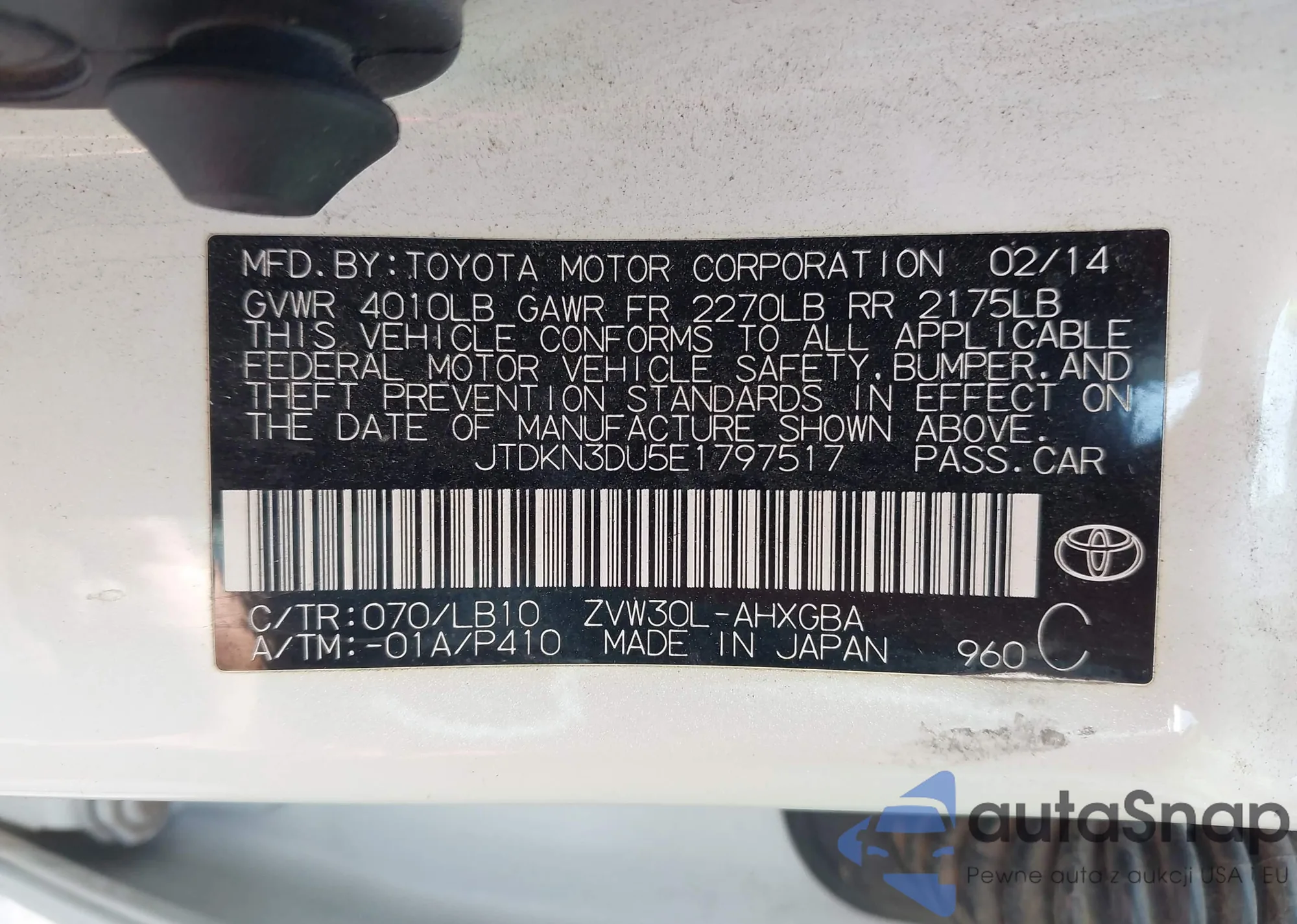 LOT: 42425777 VIN: JTDKN3DU5E1797517
