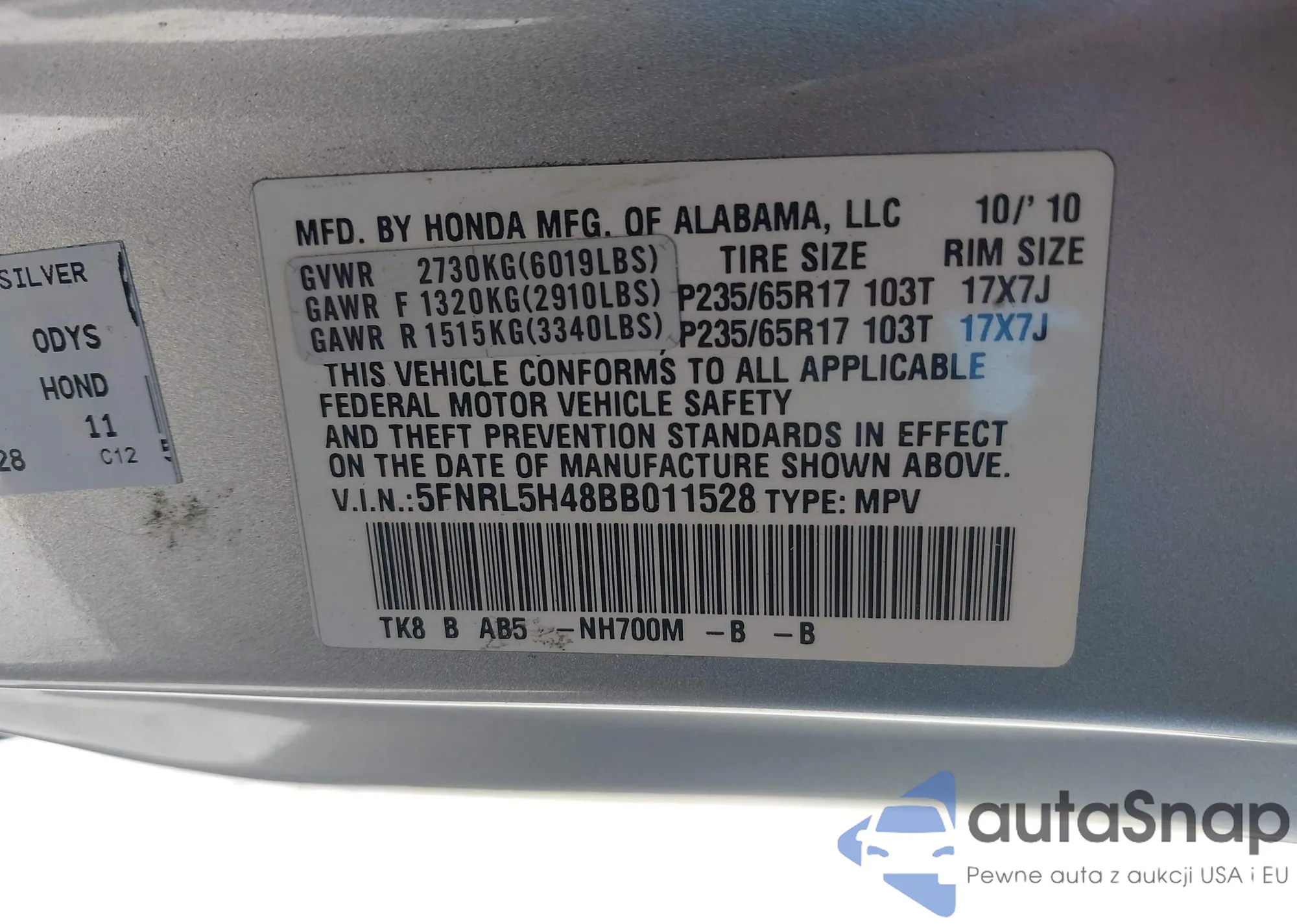 • VIN 5FNRL5H48BB011528