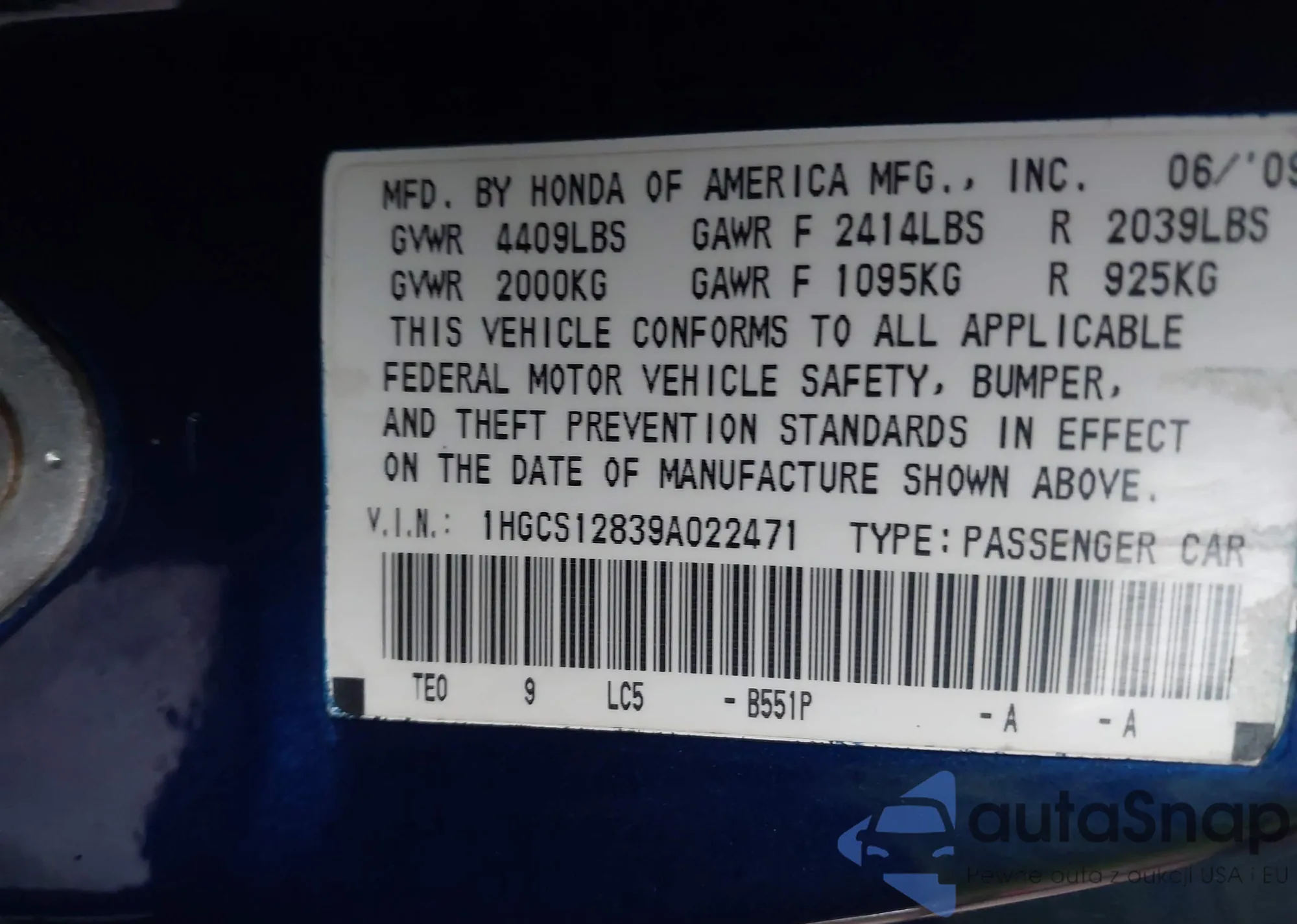 LOT: 40223513 VIN: 1HGCS12839A022471