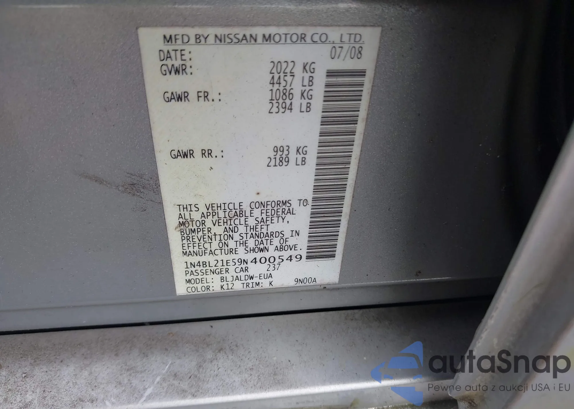 LOT: 42411231 VIN: 1N4BL21E59N400549