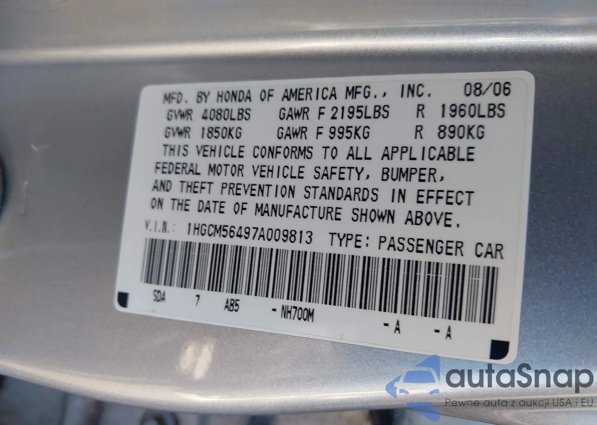 LOT: 42162974 VIN: 1HGCM56497A009813
