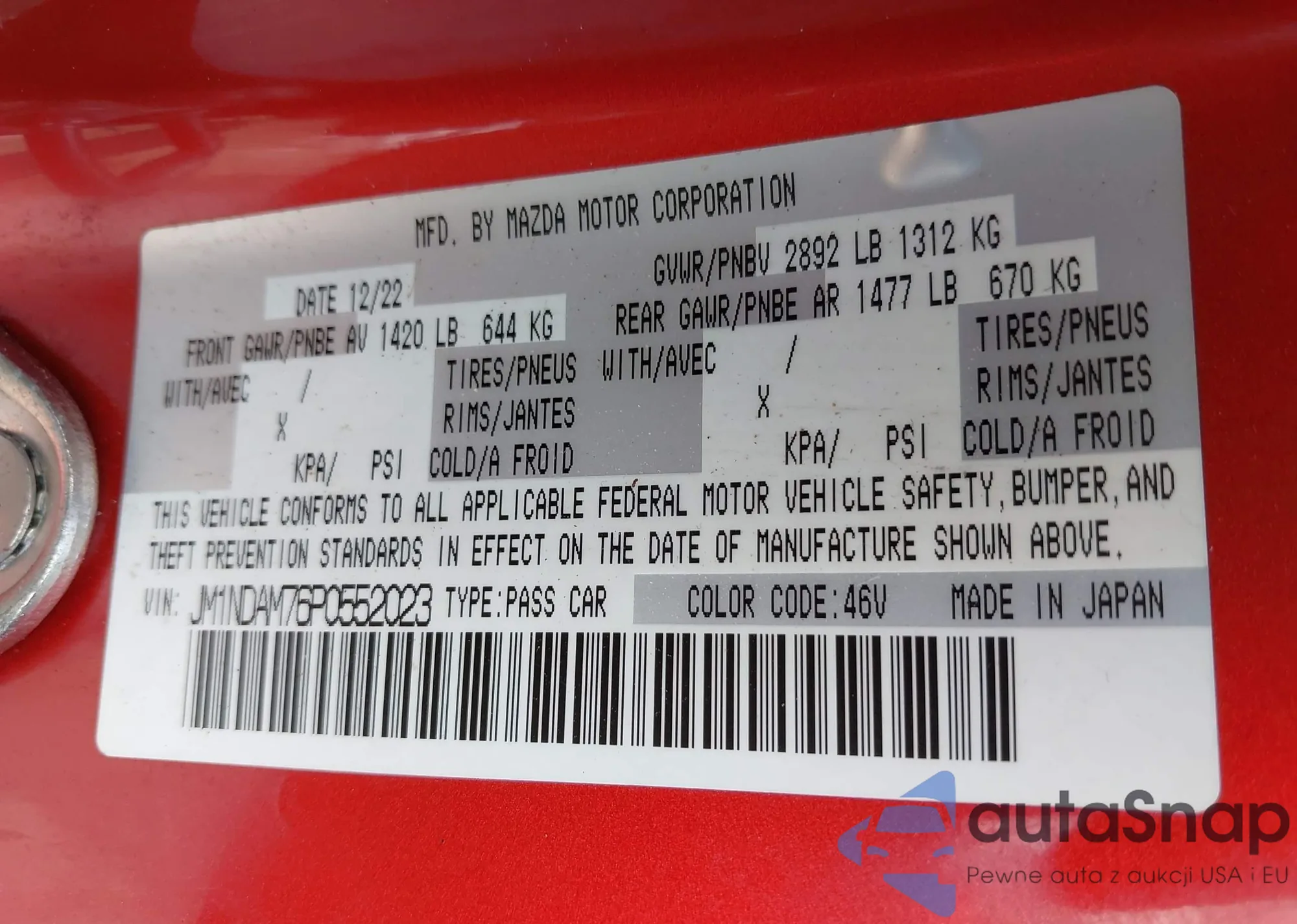 LOT: 42440868 VIN: JM1NDAM76P0552023