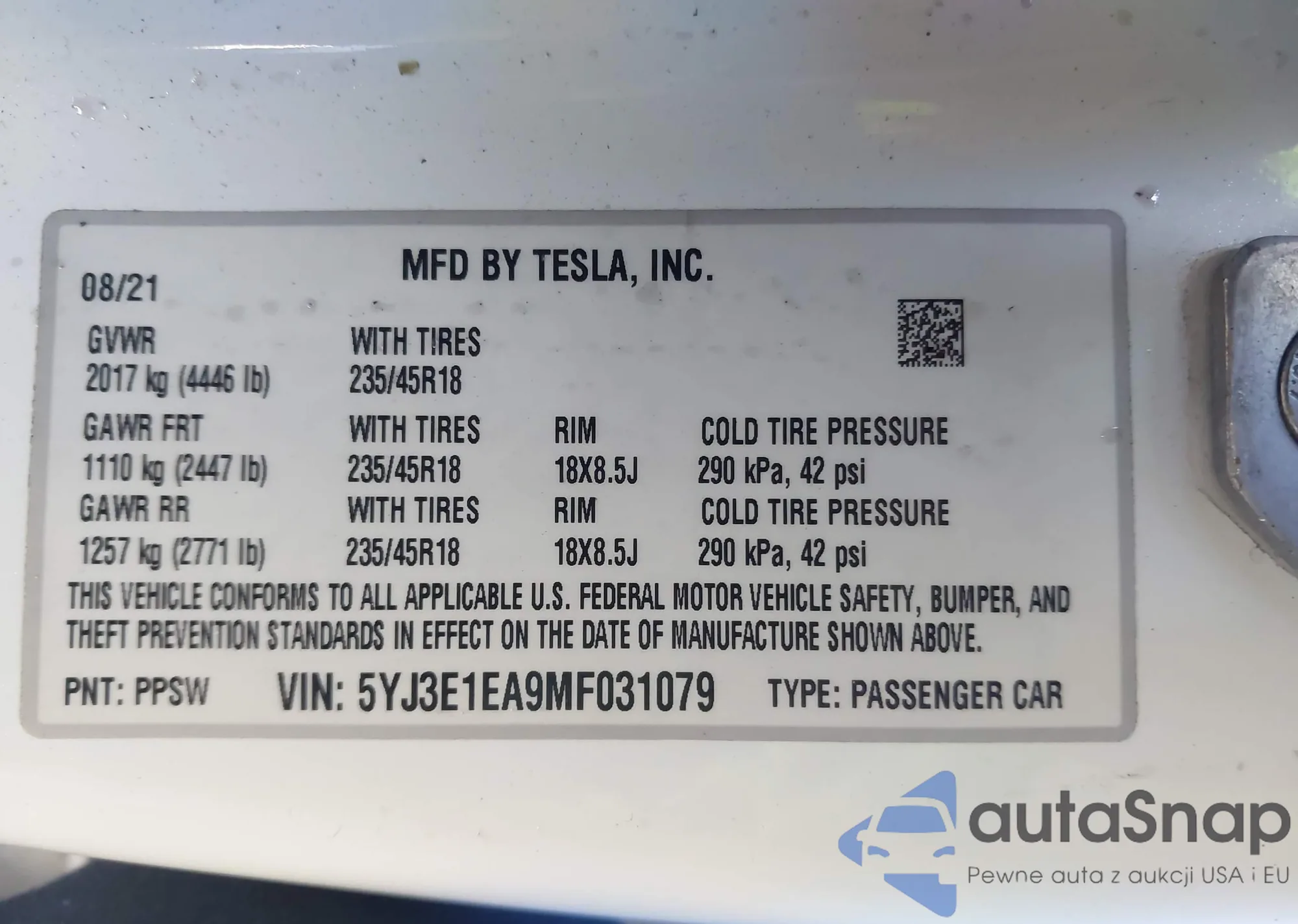 • VIN 5YJ3E1EA9MF031079