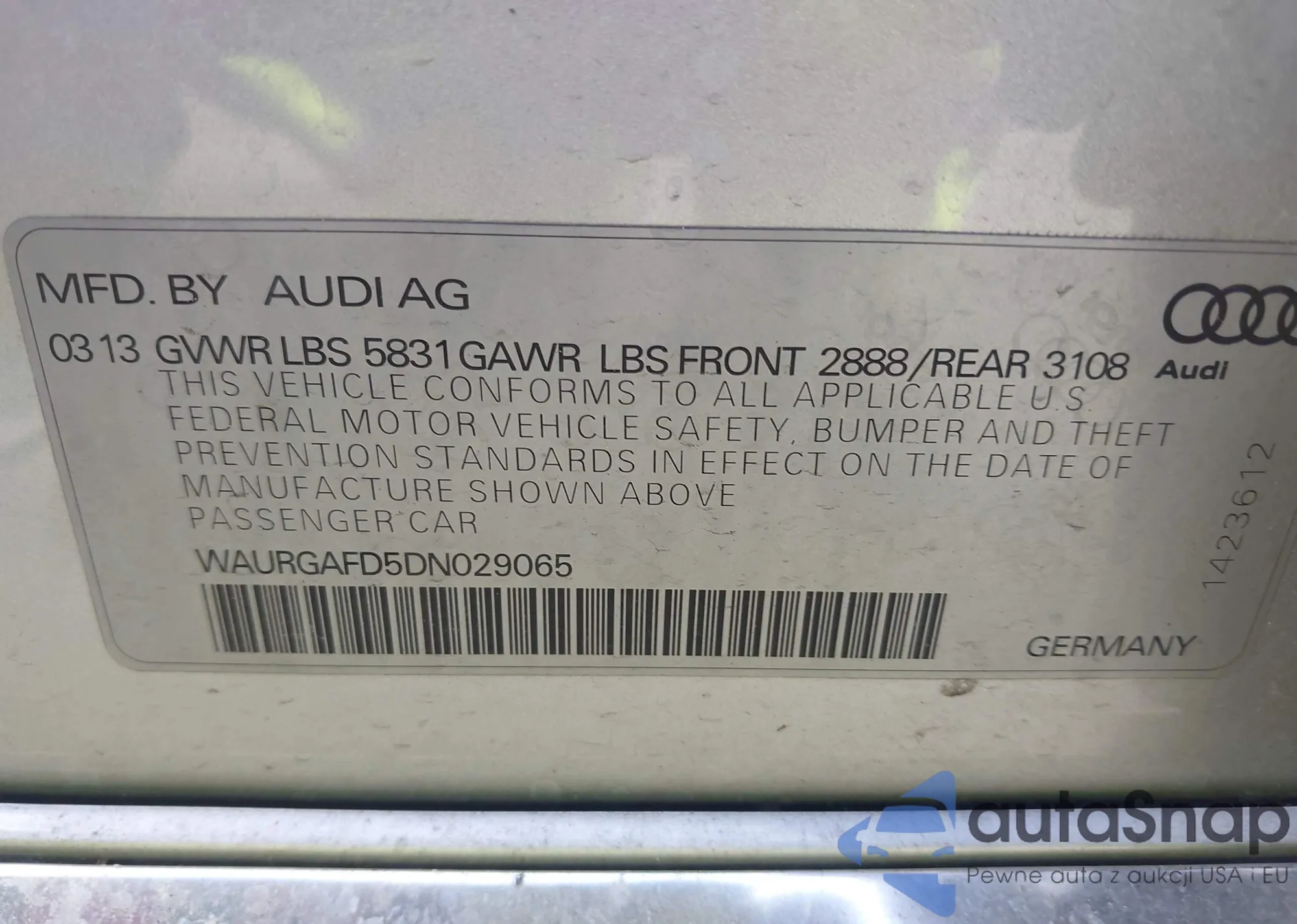 LOT: 42135494 VIN: WAURGAFD5DN029065