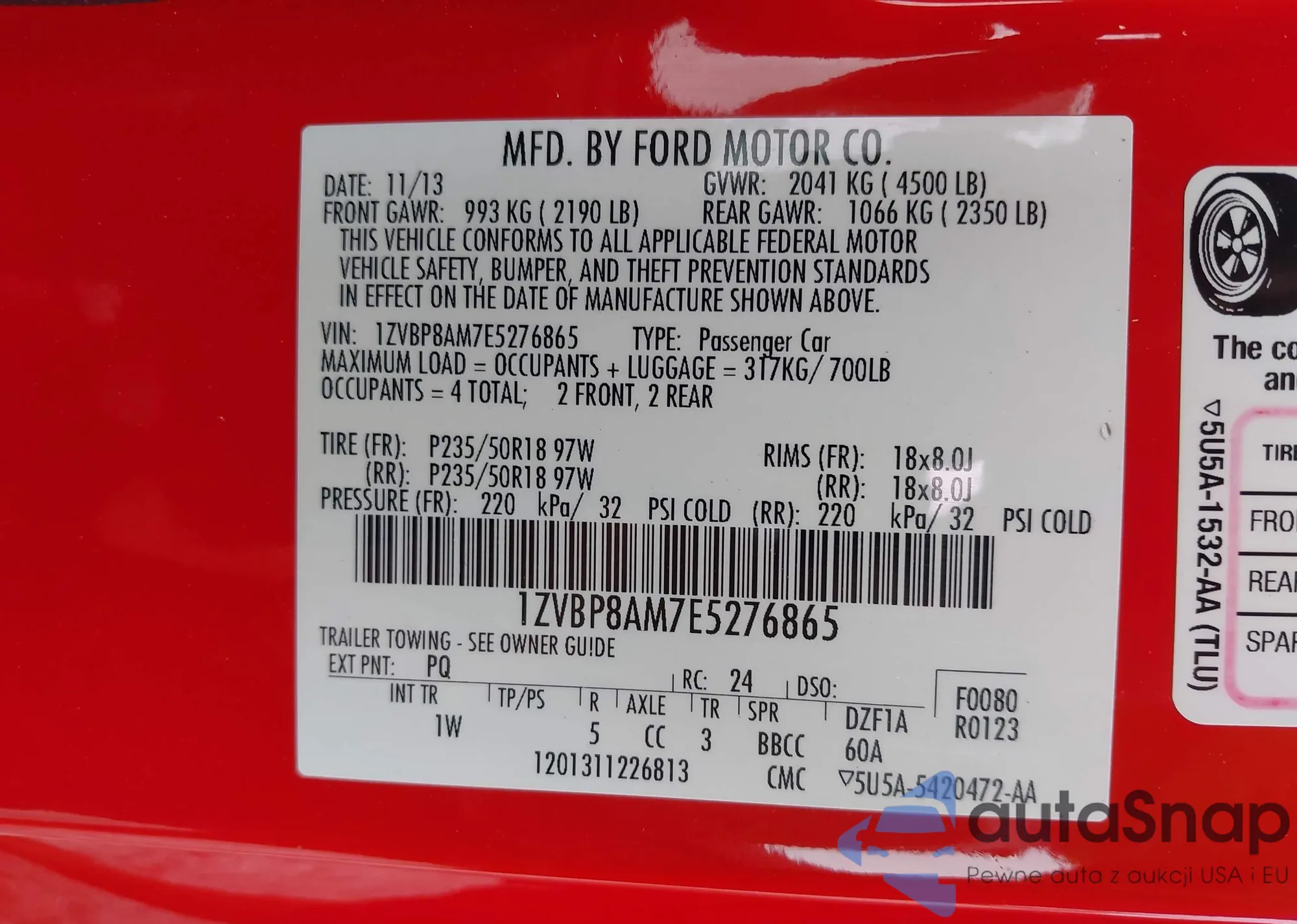 LOT: 42387476 VIN: 1ZVBP8FH9A5101068