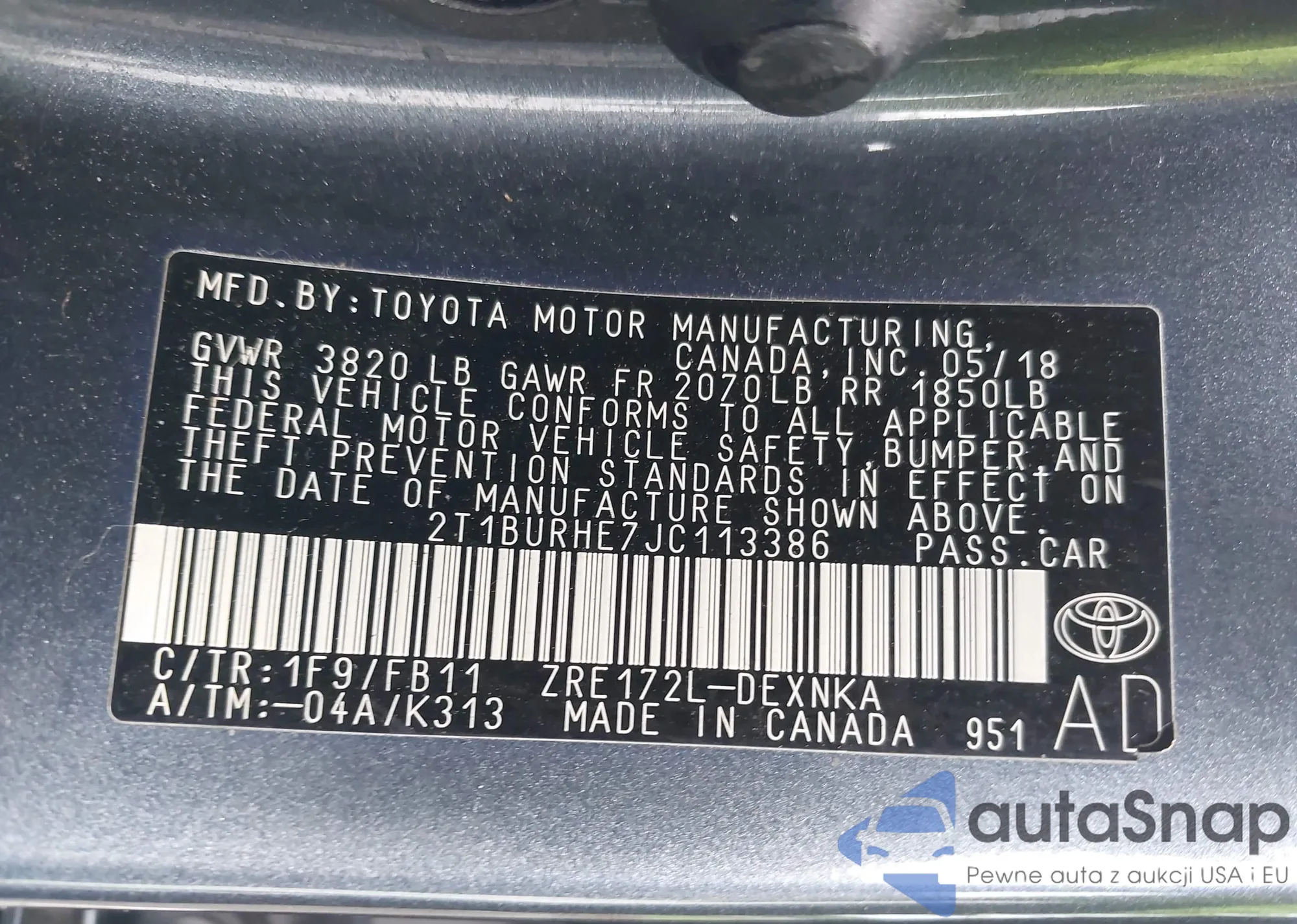 LOT: 42181796 VIN: 2T1BURHE7JC113386