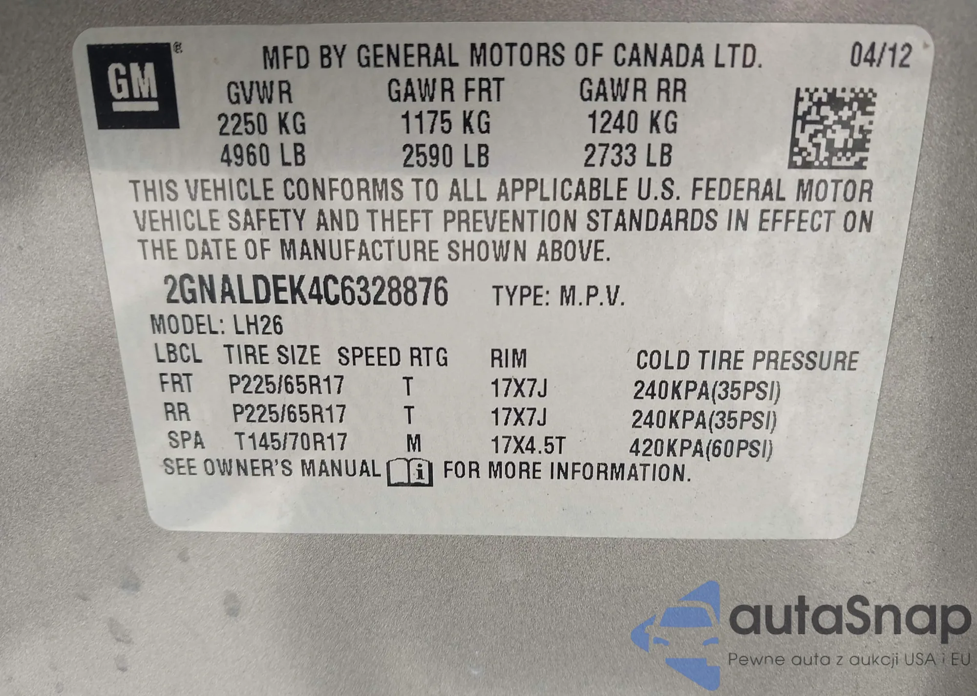 LOT: 42300439 VIN: 2GNALDEK4C6328876