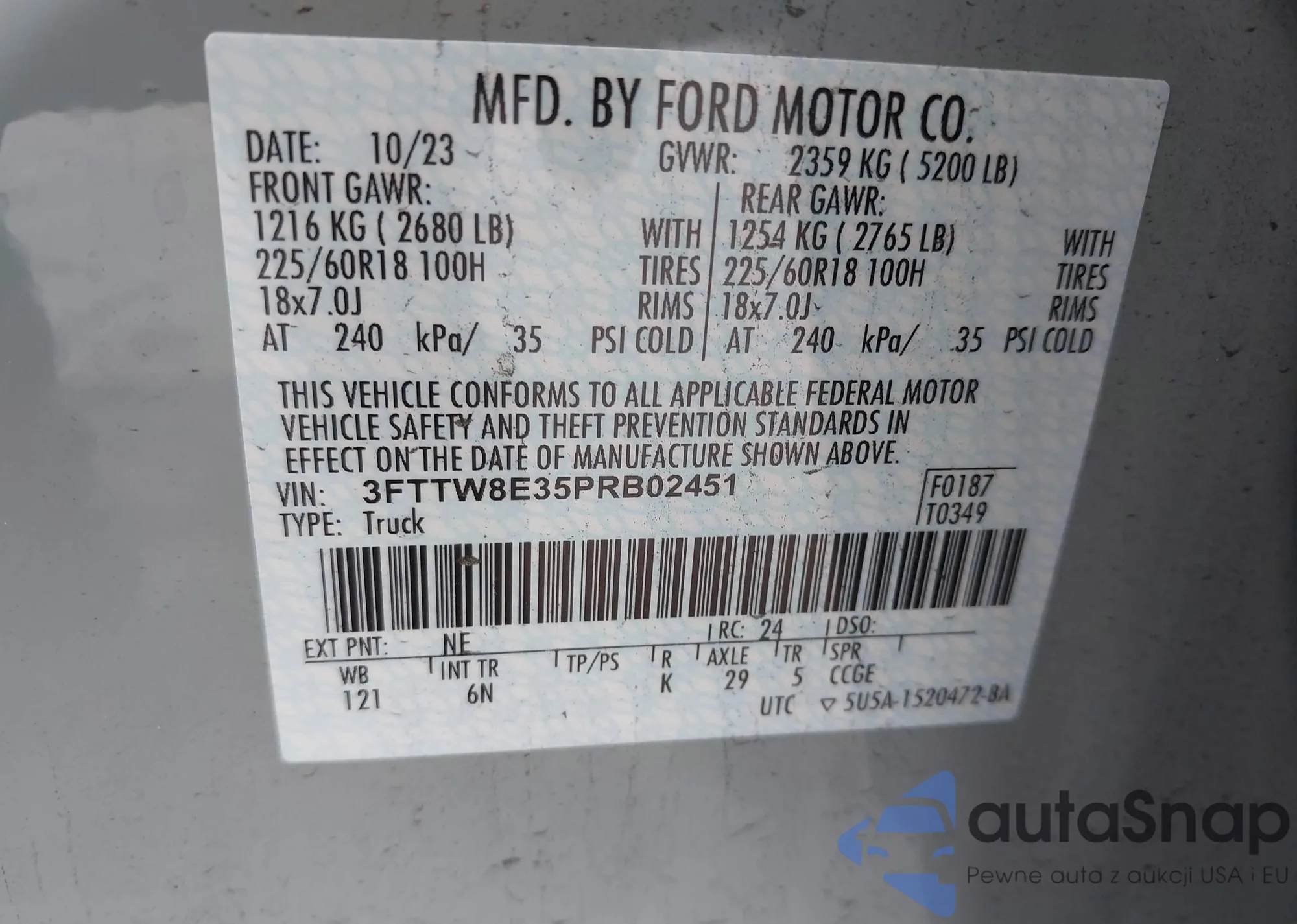 LOT: 42312955 VIN: 3FTTW8E35PRB02451