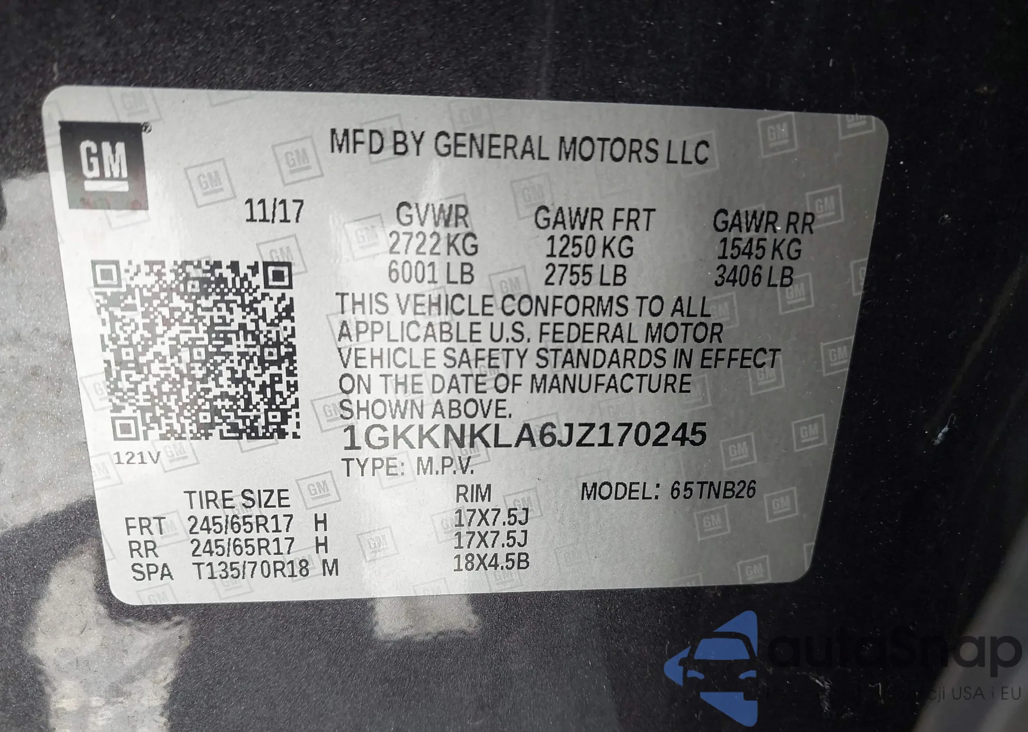 • VIN 1GKKNKLA6JZ170245