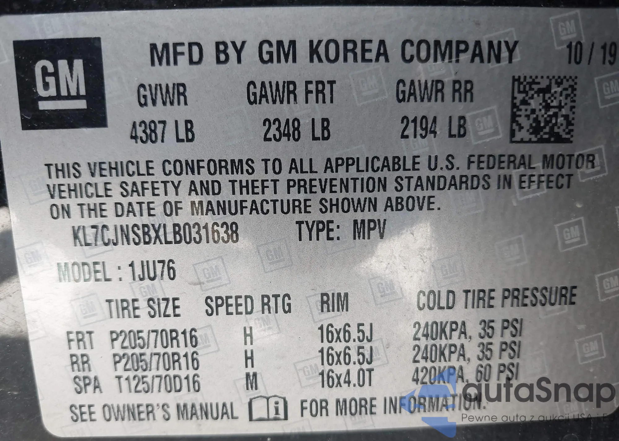 LOT: 42299513 VIN: KL7CJNSBXLB031638